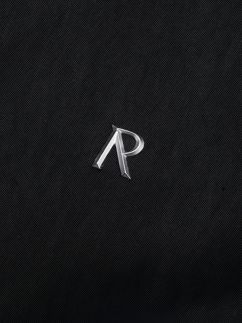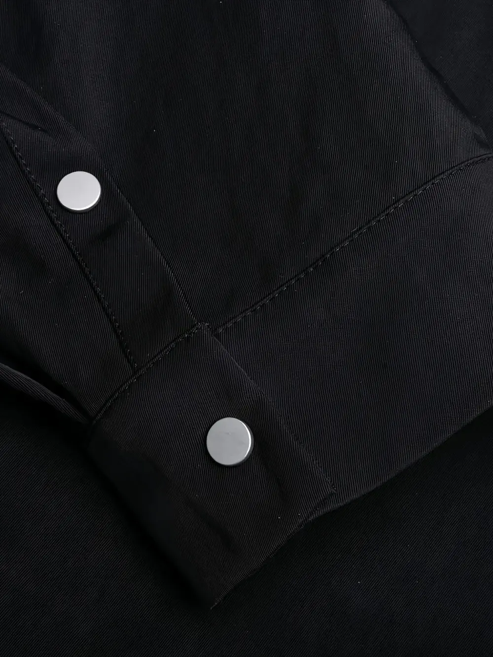 Черная застежка-молния, серебристая бляшка с логотипом, манжеты на пуговицах, классический воротник, прямой подол