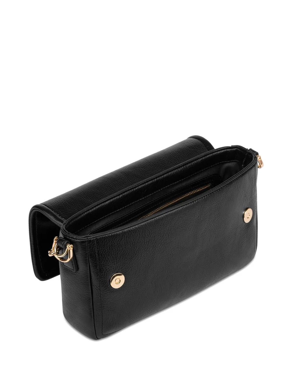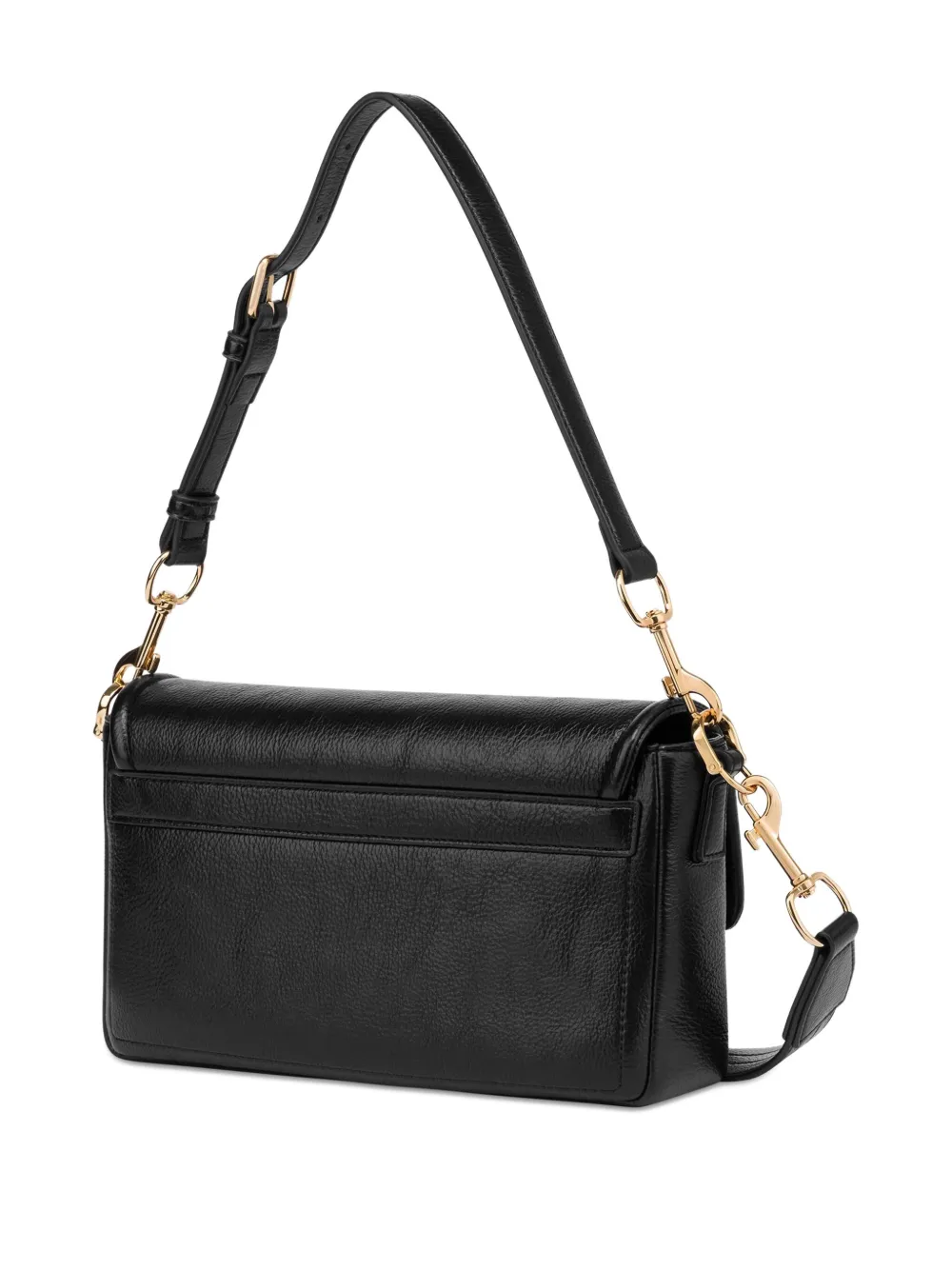 Черная золотистая пластинка с логотипом, регулируемый плечевой ремень, застежка на клапане, застежка на кнопки, фактурный кожаный эффект