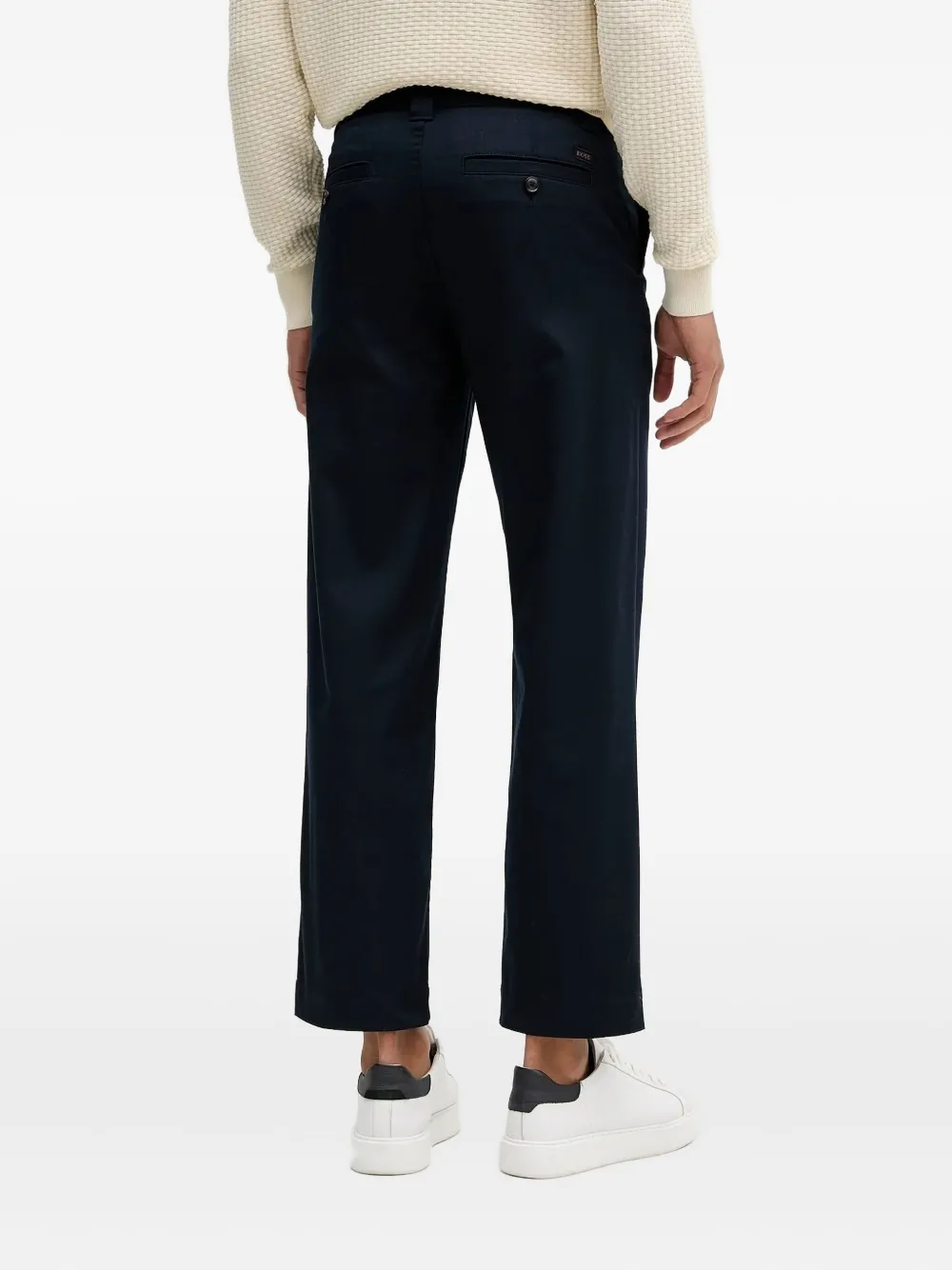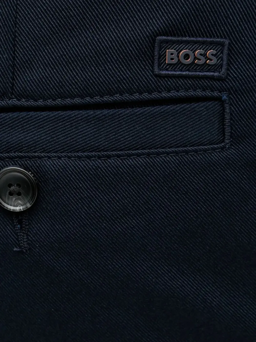 Темно-синяя саржевая текстура, застежка на пуговицы, прорезные карманы, бляшка с логотипом, прямой подол