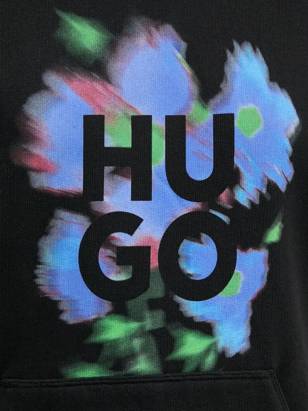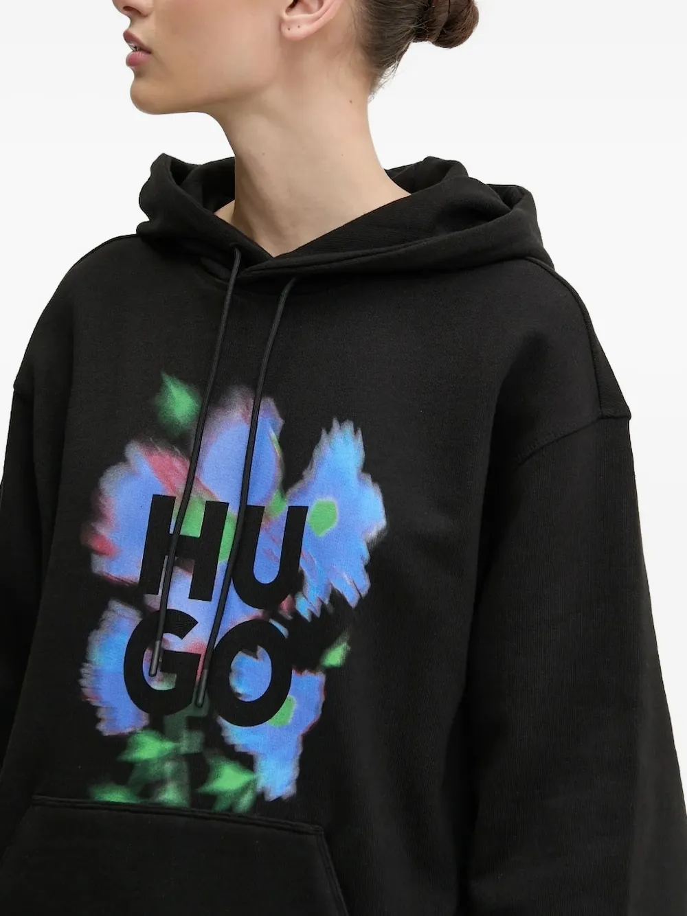 Черный цветочный принт, затягивающийся шнурком капюшон, карман-кенгуру, принт с логотипом, длинные рукава