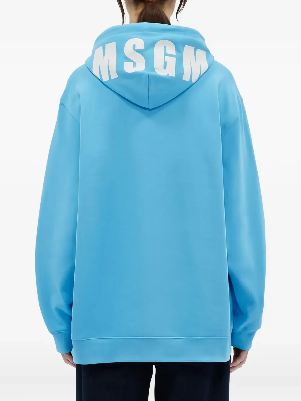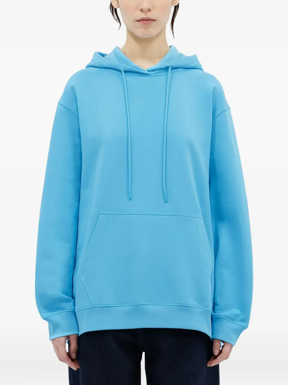 Синий капюшон, карман-кенгуру, спущенные плечи, длинные рукава, ребристый подол, ребристые манжеты.