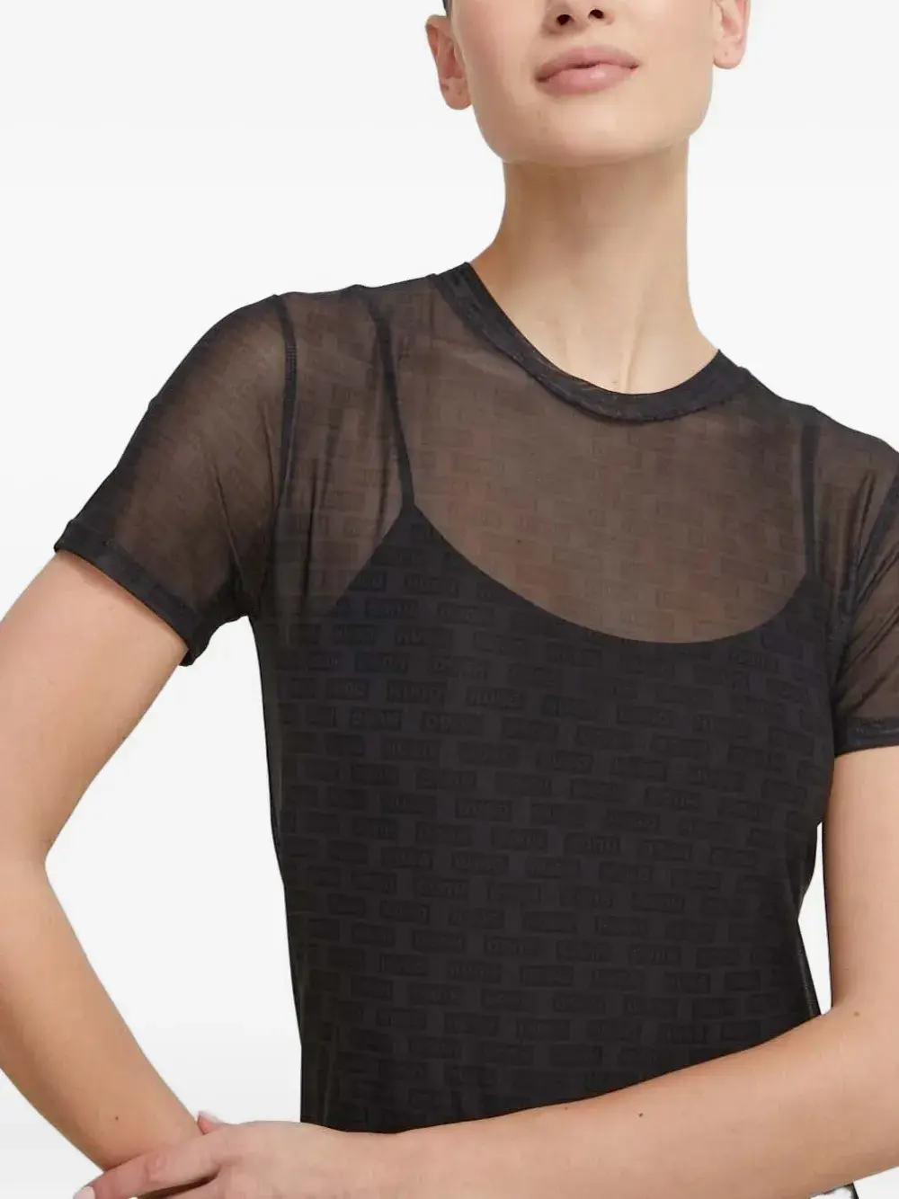 Черная сетчатая ткань, короткие рукава, круглый вырез, принт с логотипом по всей поверхности, полупрозрачная ткань