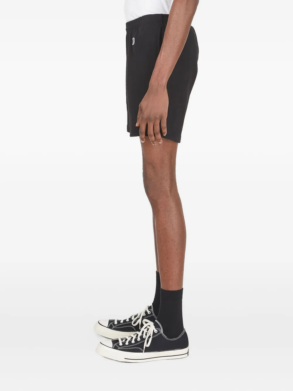 Черный трикотажный плетеный пояс с эластичной резинкой, боковые накладные карманы, накладной карман сзади, боковой принт с логотипом
