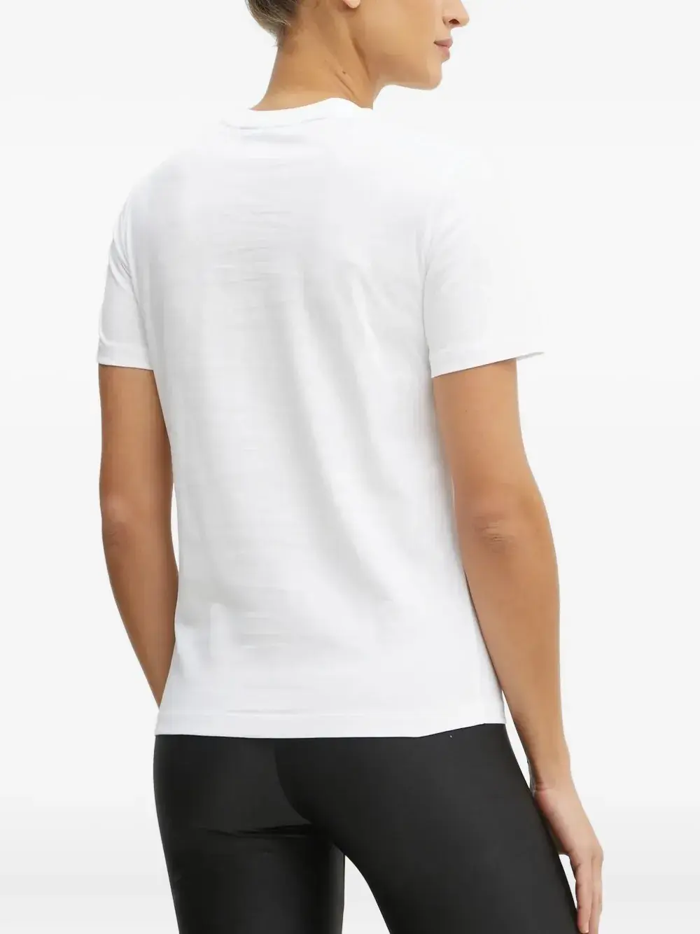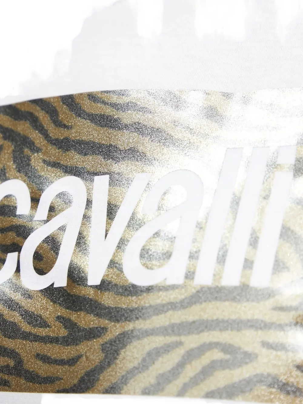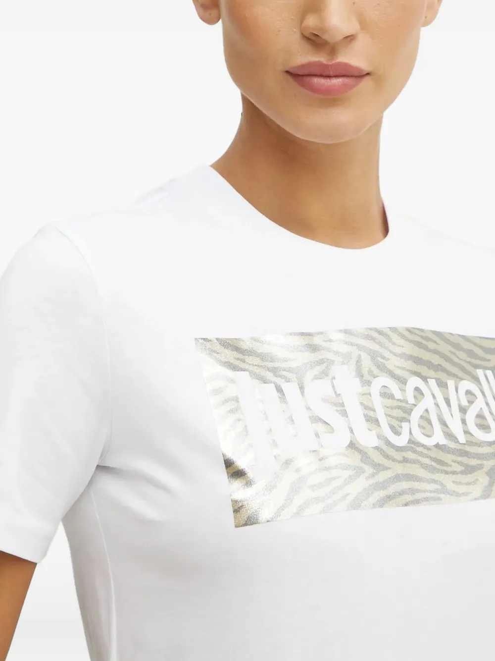 Белая футболка с короткими рукавами, круглым вырезом и принтом зебры, логотипом с металлическим эффектом.