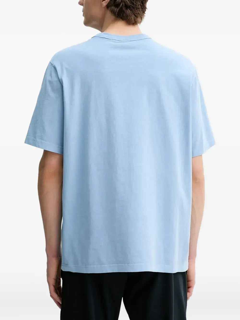 Светло-голубой с короткими рукавами и круглым вырезом, с логотипом и принтом