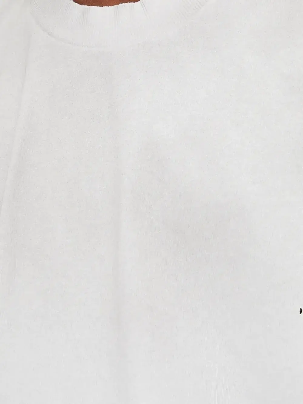 Белый с короткими рукавами, потертыми деталями, принтом логотипа, круглым вырезом.