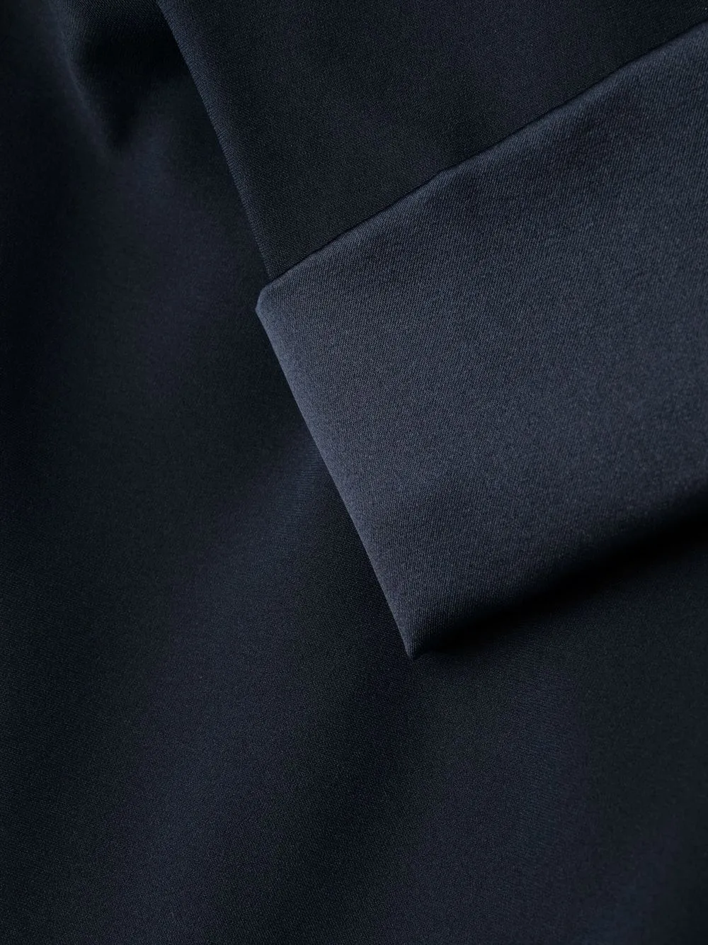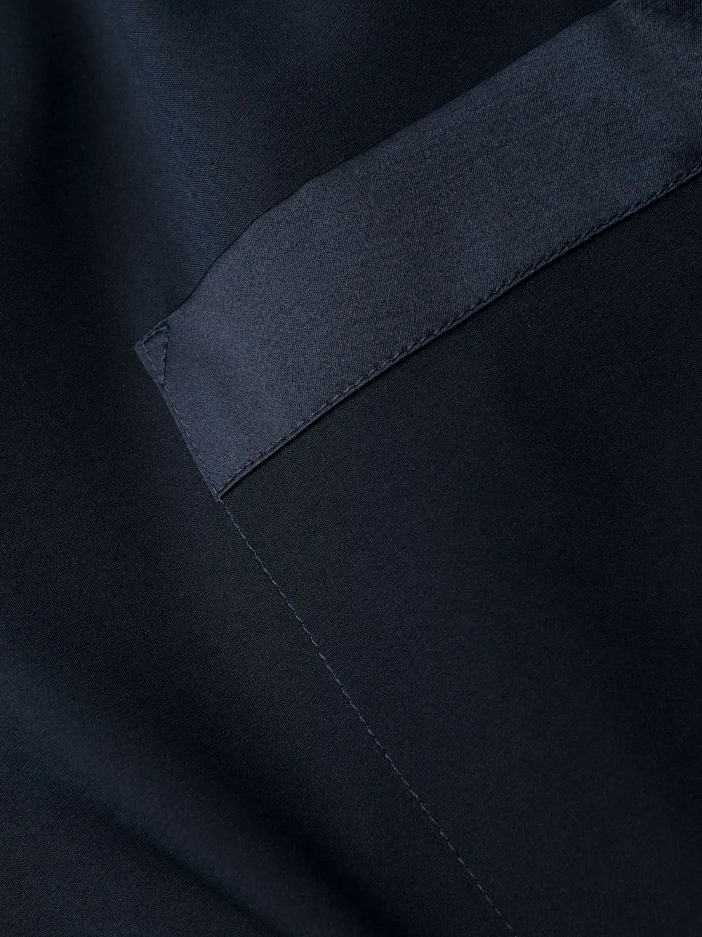 Лацканы-шалька, юбка с запахом, кулиска на талии, длинные рукава и два передних кармана.