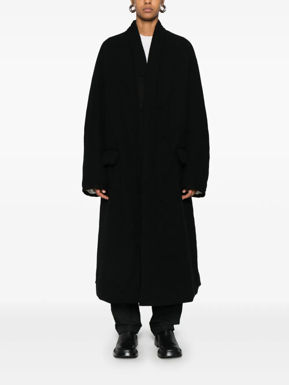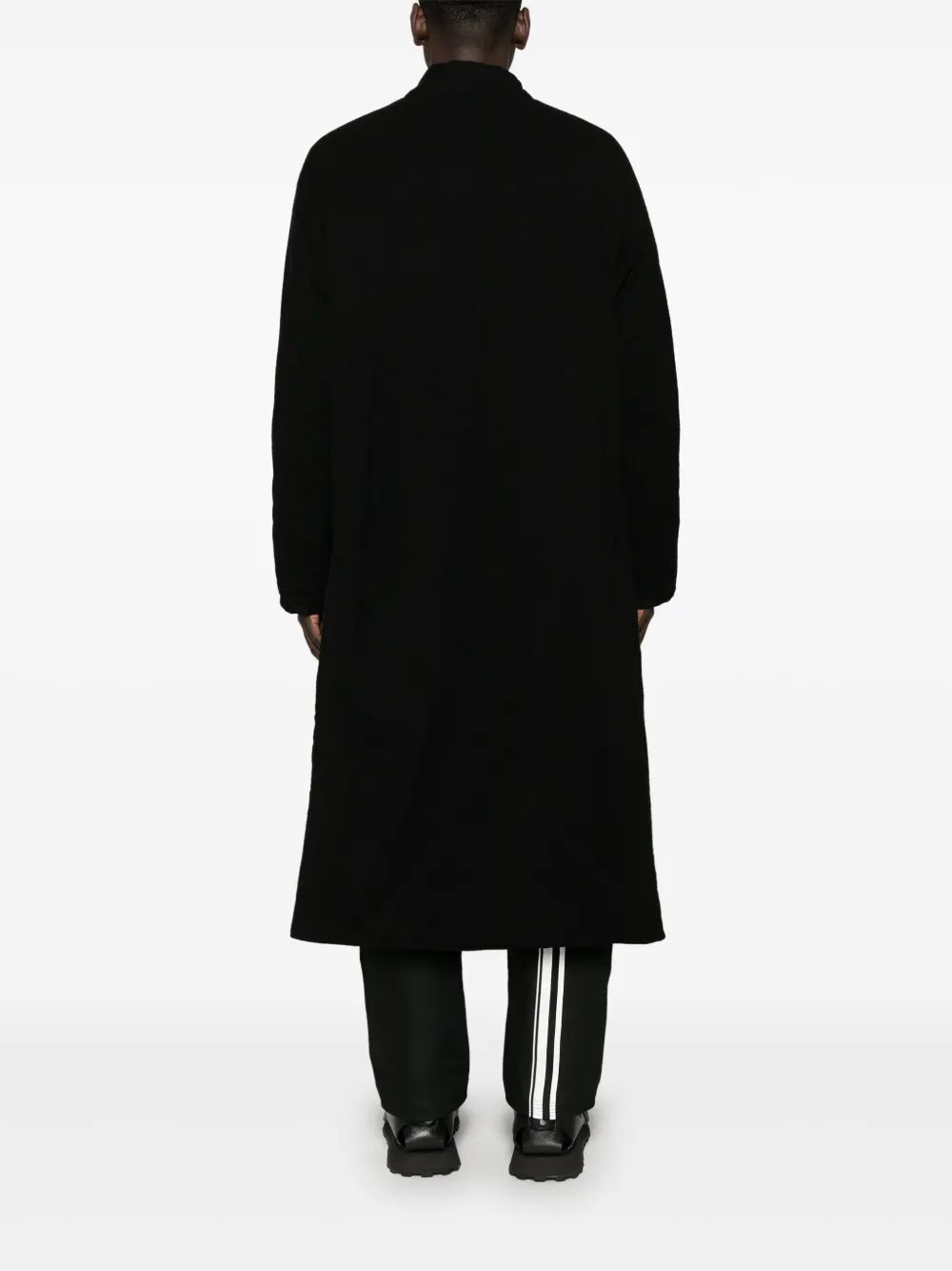 Подробнее о товаре: • черный • вирджинская шерсть • флисовый материал • дутый материал • потайная пуговичная застежка спереди • V-образный вырез • длинные рукава реглан • два кармана с клапанами по бокам • разрезы сзади • внутренний прорезной карман • атласная подкладка • прямой подол • длинная модель • Это унисекс-модель. Обратите внимание, что для нее используется мужская размерная сетка.