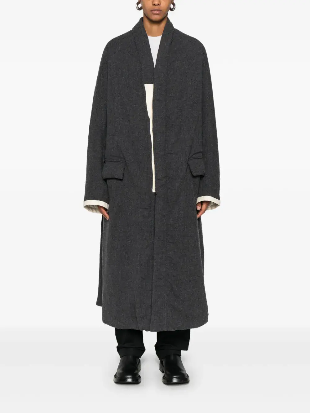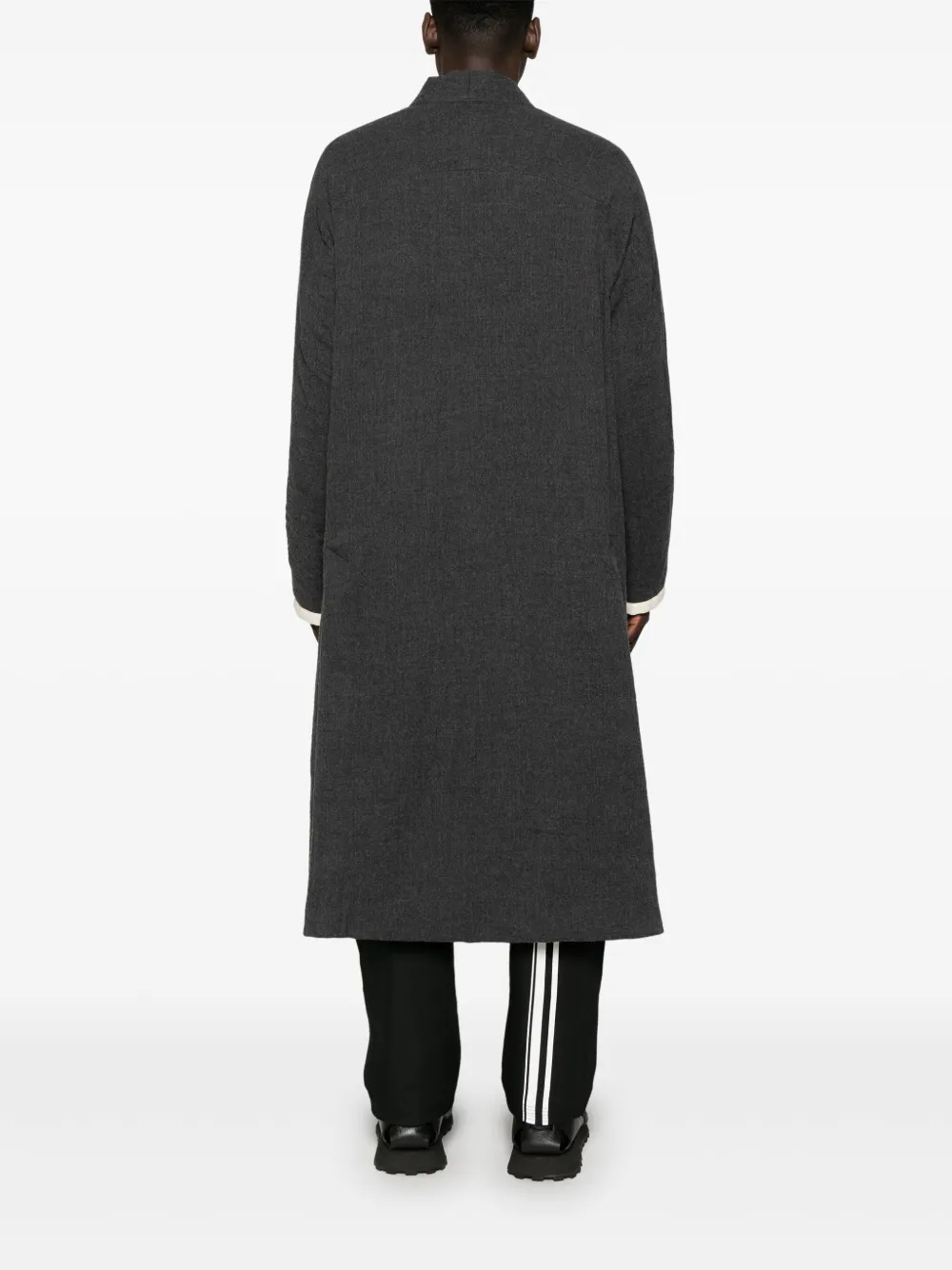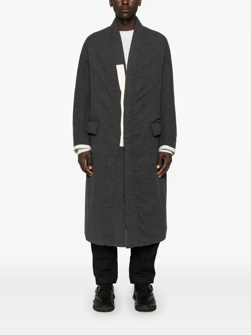 Подробнее о товаре: • антрацитово-серый • вирджинская шерсть • флисовый материал • дутый материал • потайная пуговичная застежка спереди • V-образный вырез • длинные рукава реглан • два кармана с клапанами по бокам • разрезы сзади • внутренний прорезной карман • атласная подкладка • прямой подол • длинная модель • Это унисекс-модель. Обратите внимание, что для нее используется мужская размерная сетка.