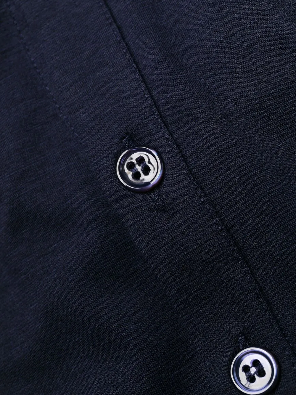 Круглый вырез, планка на пуговицах спереди, длинные рукава и прямой подол.