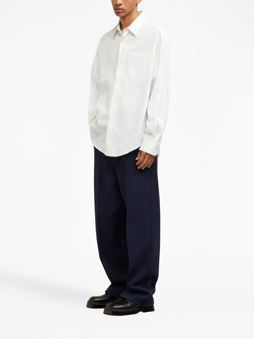 Белый, хлопок, нагрудный накладной карман, длинные рукава и застежка на пуговицах спереди. Это унисекс-модель. Обратите внимание, что для нее используется мужская размерная сетка.