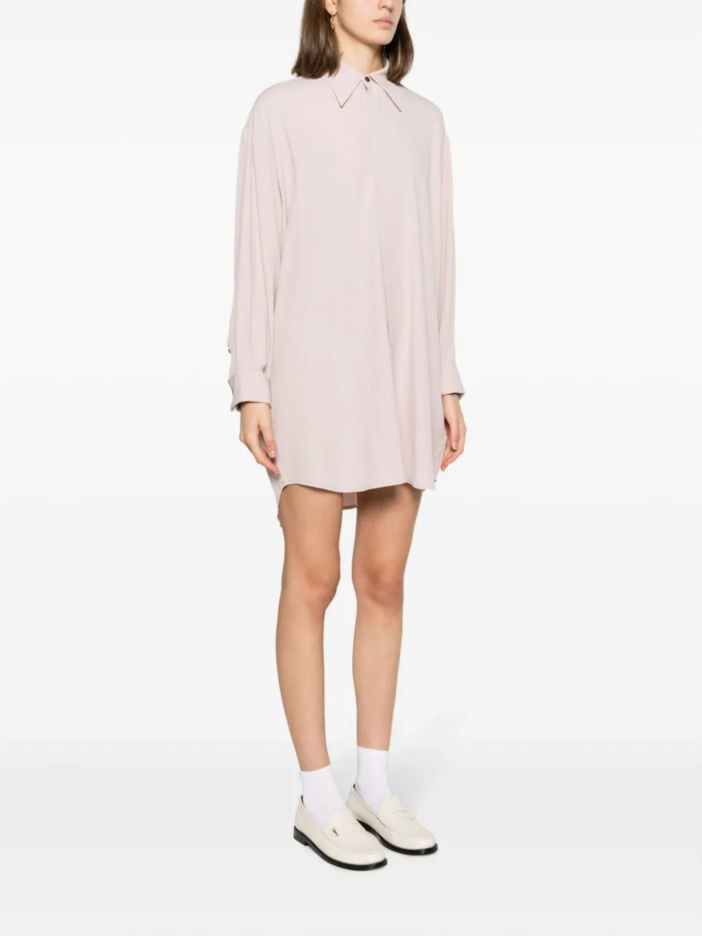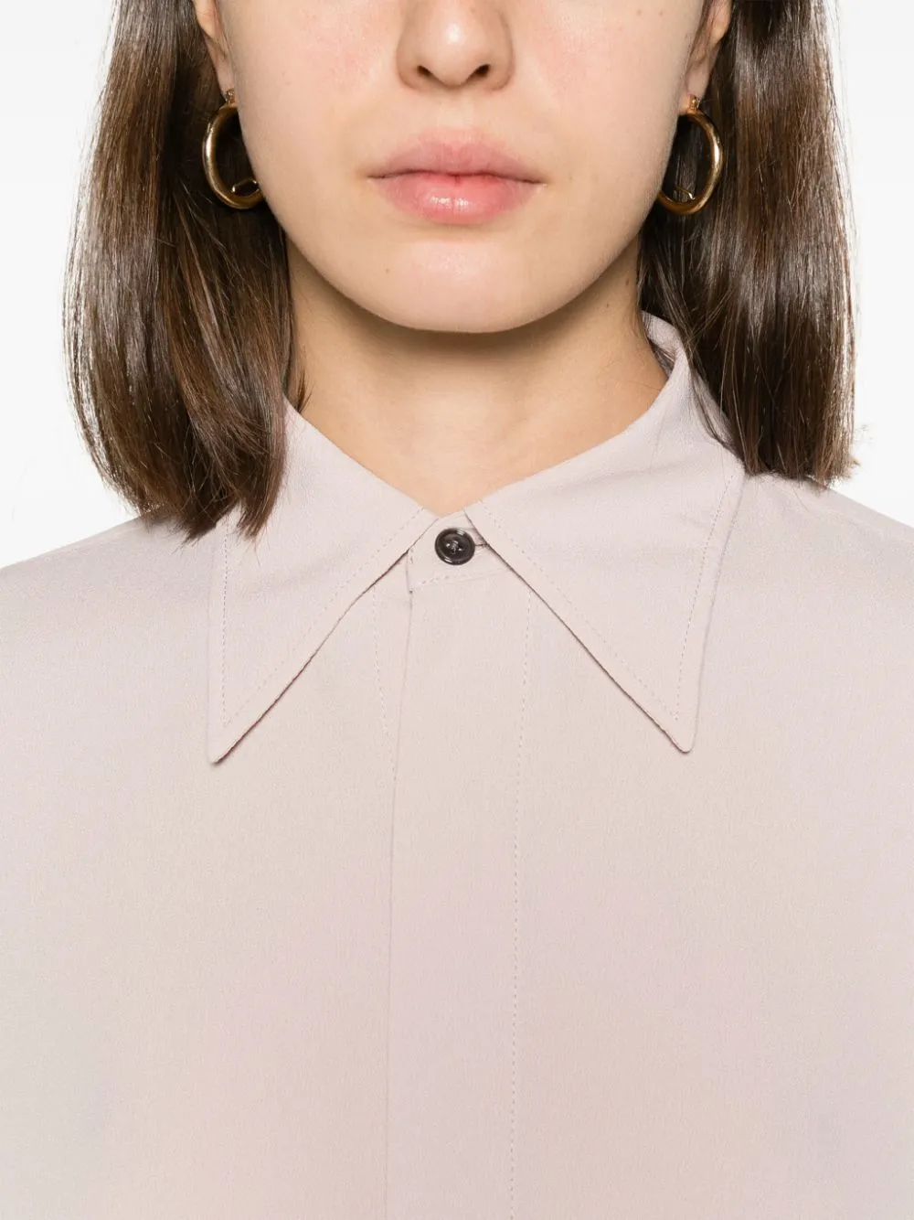 Расцветка Poudre Pink, креповая текстура, классический воротник, потайная пуговичная застежка спереди, приспущенные плечи, рубашечные рукава, французские манжеты, манжеты на пуговицах, закругленный подол сзади и длина до бедер.