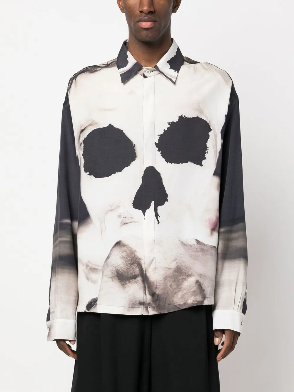 Черный/белый, сплошной графичный принт, принт с изображением черепа, классический воротник, застежка на пуговицах спереди, потайная застежка спереди, длинные рукава и прямой подол.