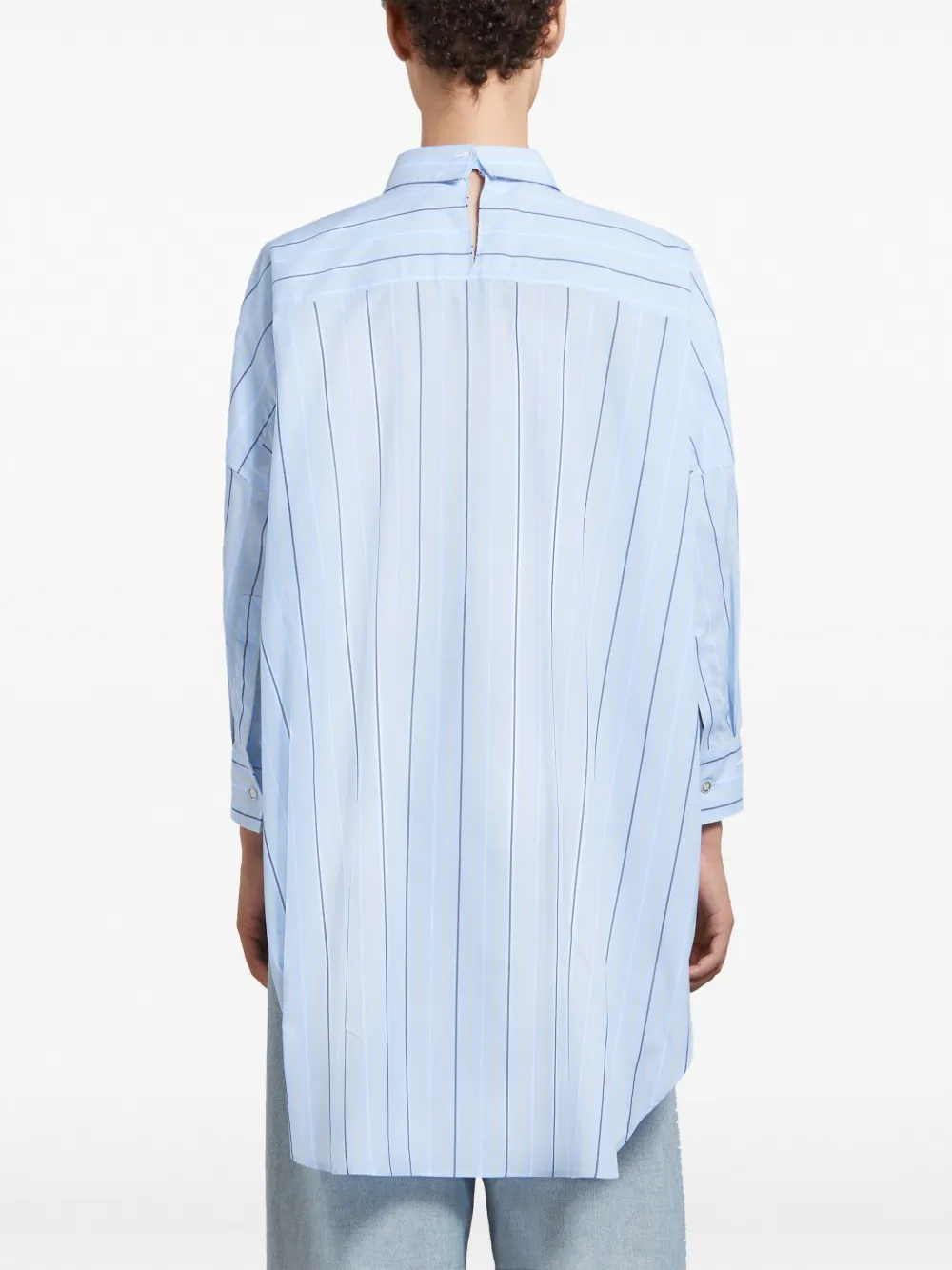 Пудрово-голубой, разноцветный, хлопок, поплин, узор в вертикальную полоску, принт с логотипом на груди, плоский заостренный воротник, застежка на пуговицах спереди, приспущенные плечи, длинные рукава, манжеты на пуговицах, нагрудный накладной карман, неравномерный подол и длинная модель.