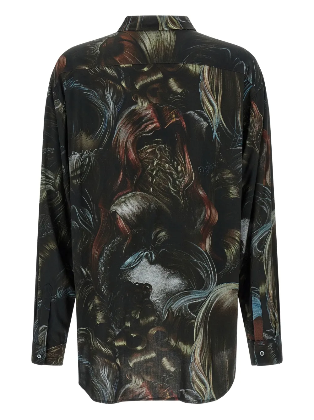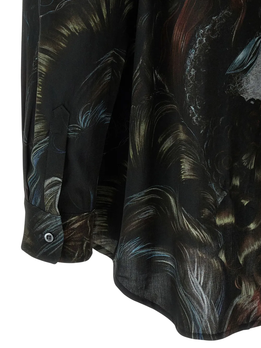 Коричневый принт по всей поверхности, застежка на пуговицы спереди, воротник, длинные рукава с манжетами, асимметричный подол