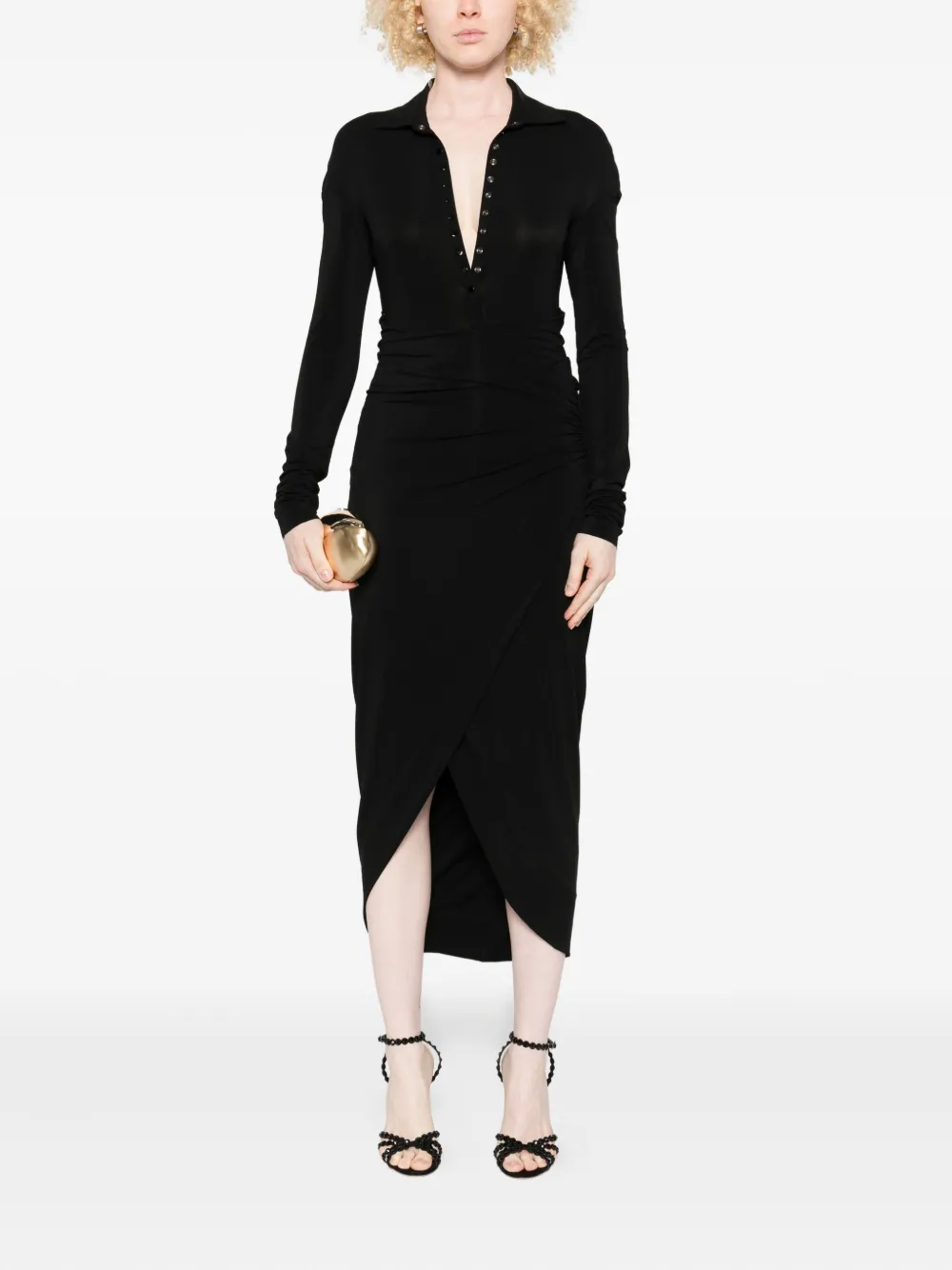 Черная закрученная деталь, длинные рукава, воротник-поло, детали на пуговицах, асимметричный подол