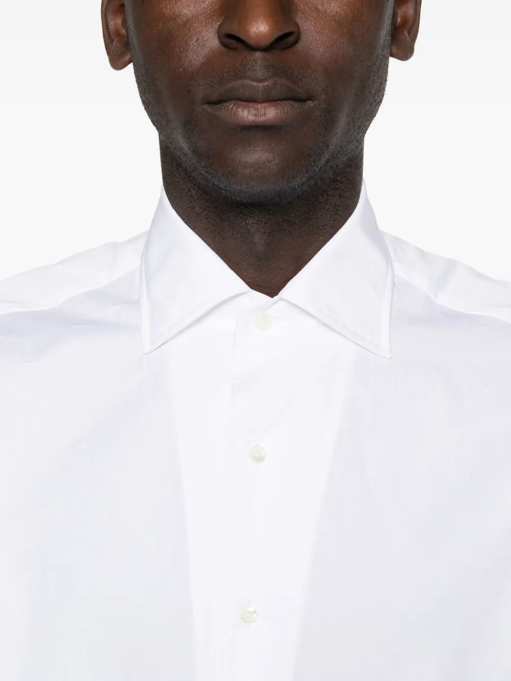 Белый, длинный рукав, застежка на пуговицы, воротник, закругленный подол, хлопок