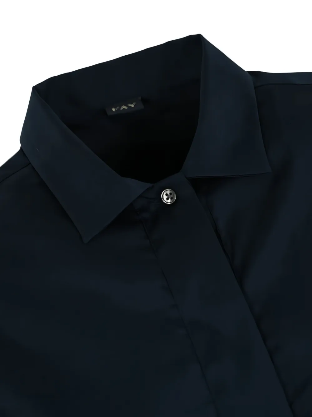Темно-синий классический воротник, длинные рукава, застежка на пуговицы, прямой подол.