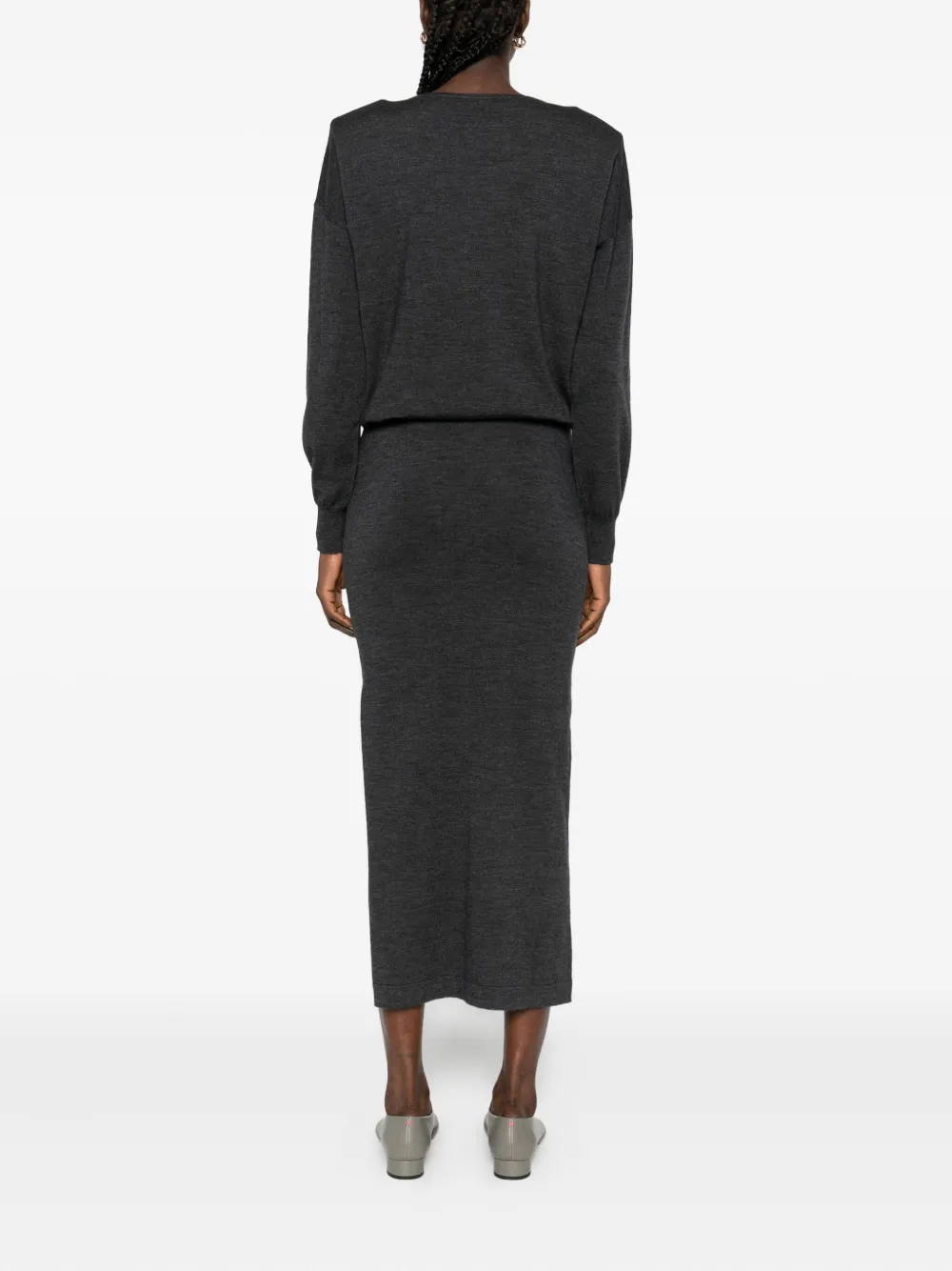 Серый, с длинными рукавами, круглым вырезом, длиной миди, шерстяной смесовой