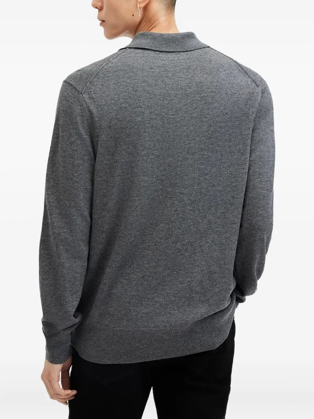Серый ворот поло, длинные рукава, застежка на пуговицы, вышитый логотип, ребристые отделки.