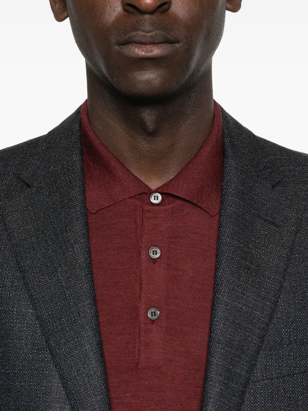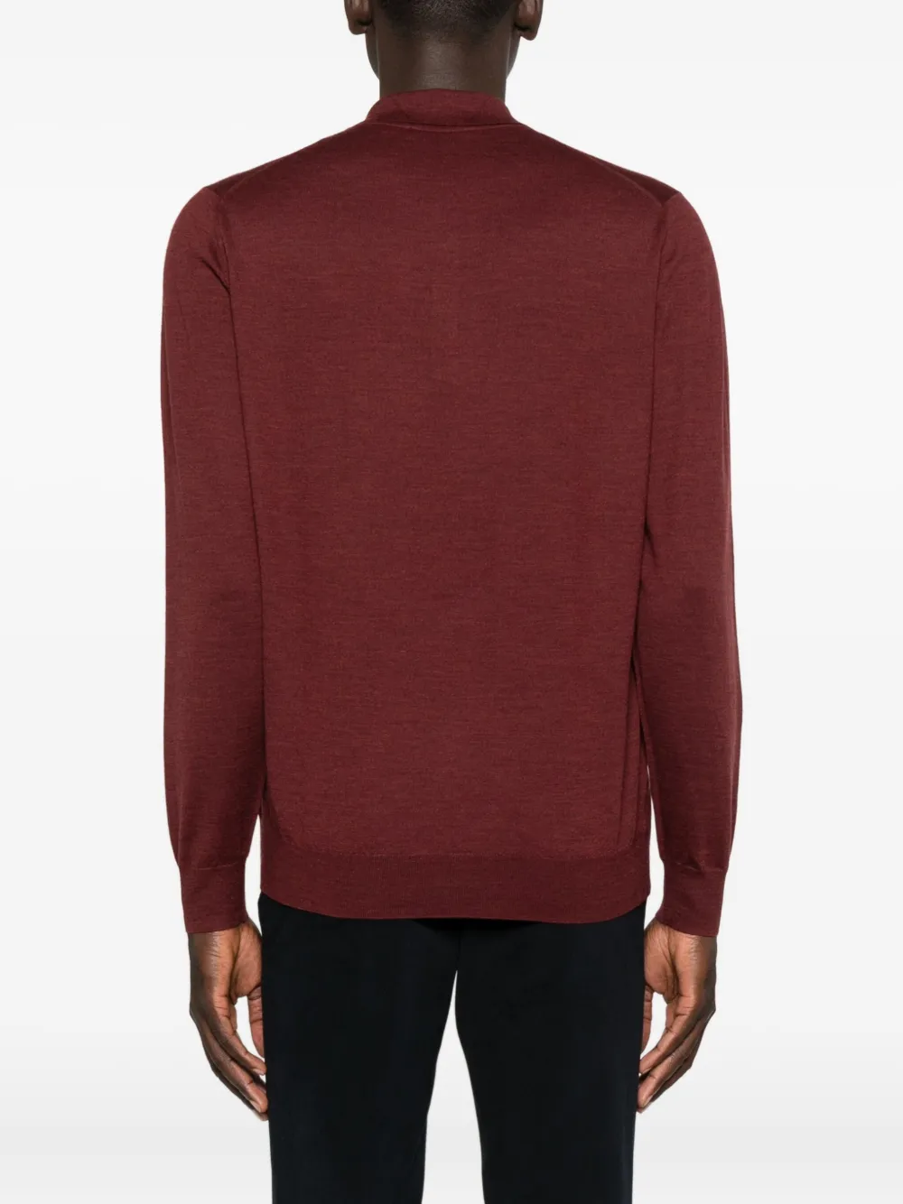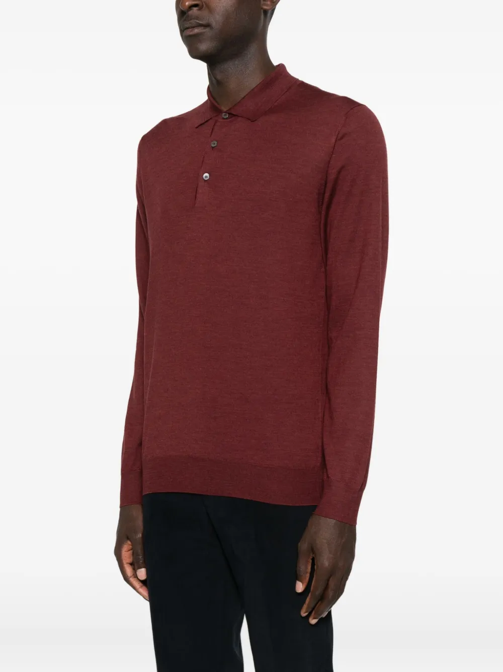 Красный ворот поло с длинными рукавами, застежкой на пуговицы, прямым подолом.