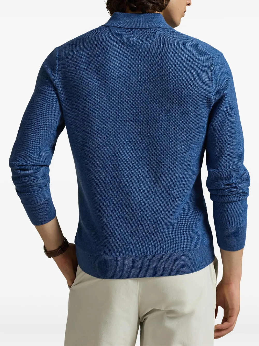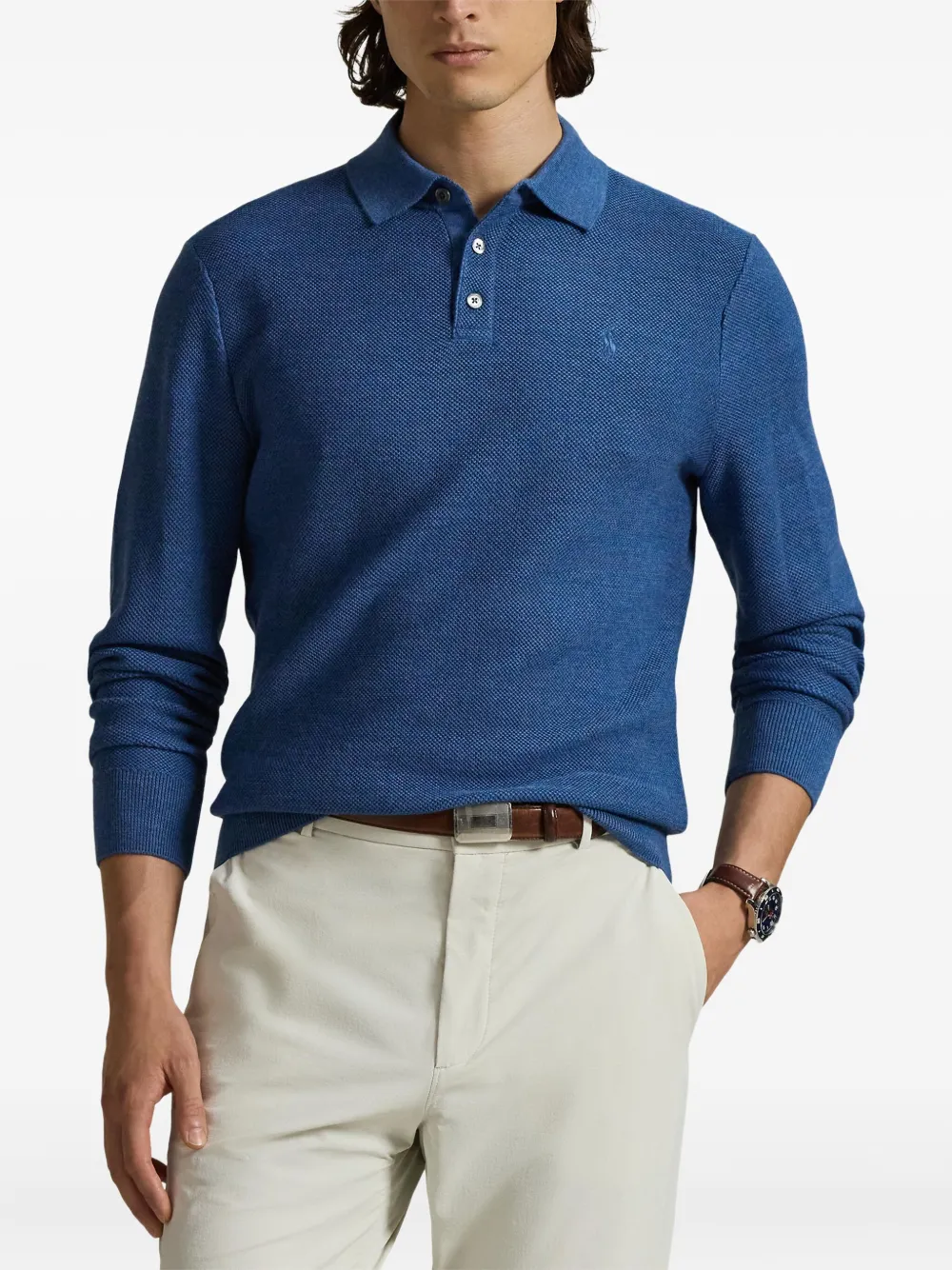 Синий фактурный трикотаж с длинными рукавами, воротником-поло, застежкой на пуговицы, вышитым логотипом.