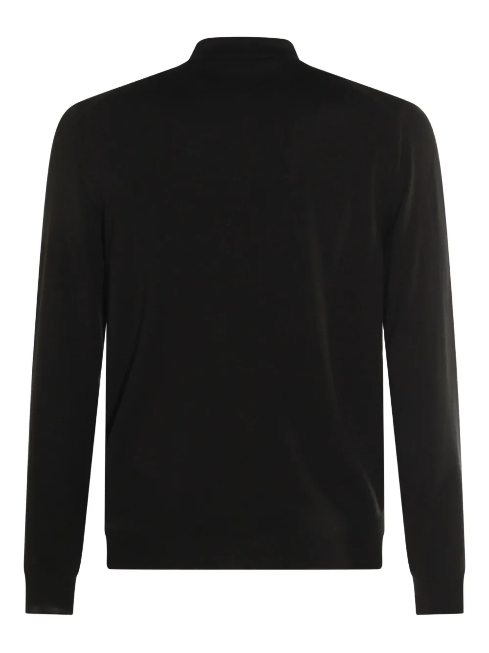 Черная водолазка с длинными рукавами, застежкой на пуговицы и ребристыми манжетами.