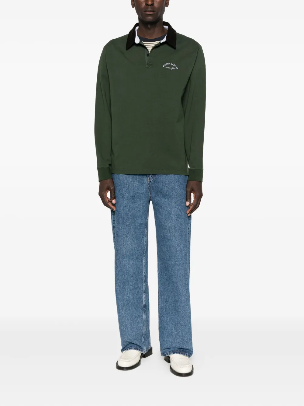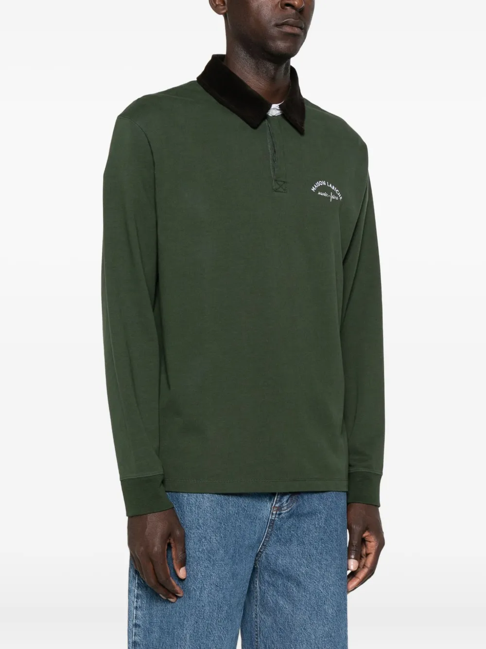 Длинные рукава, зеленый бархатный воротник, планка на пуговицах, вышитый логотип, ребристые манжеты.