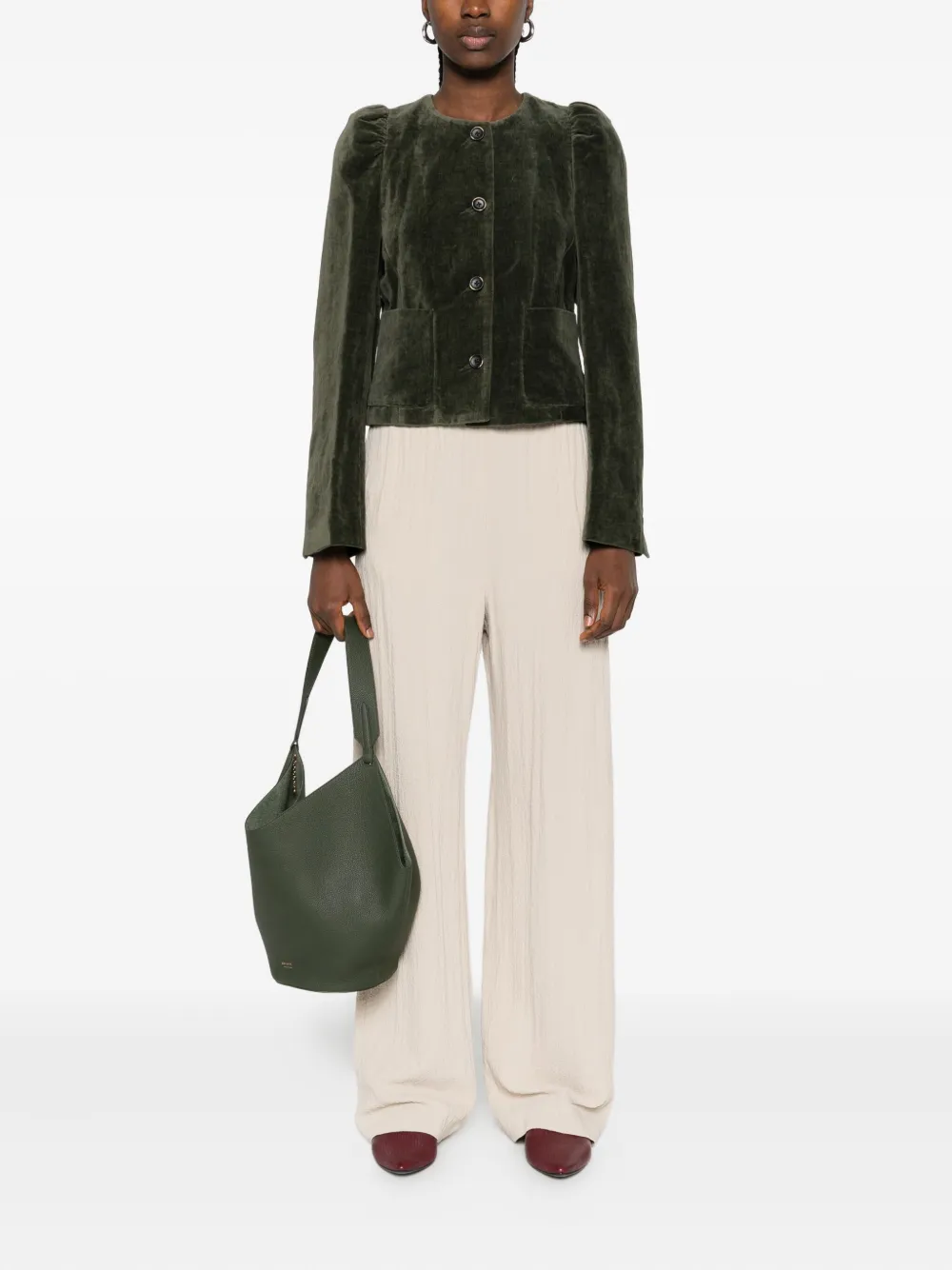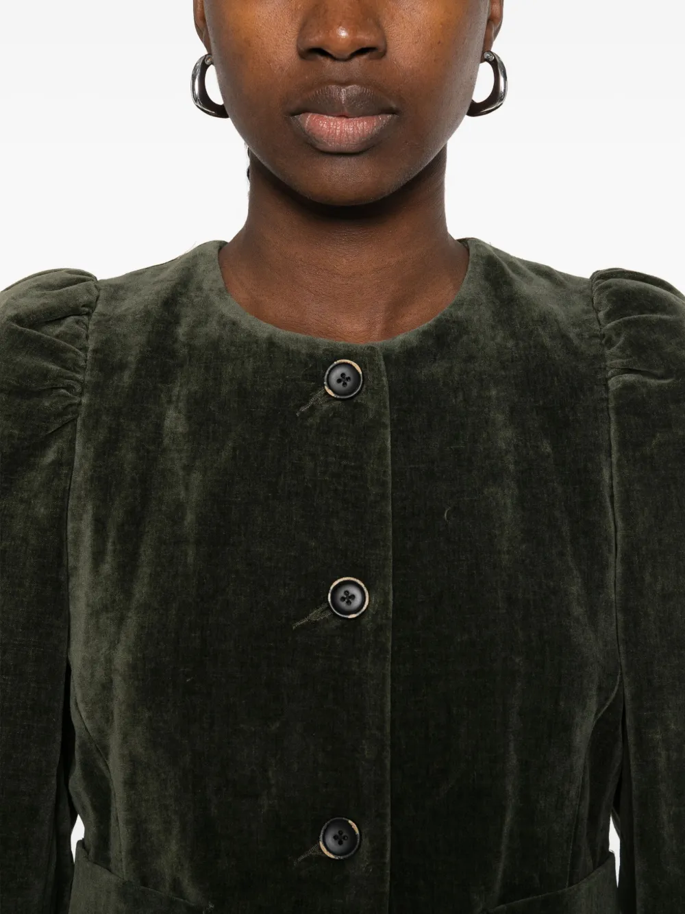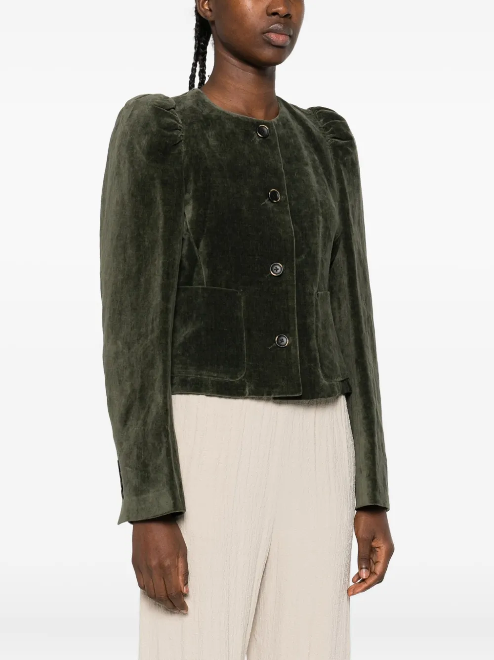 Темно-зеленая бархатная текстура, застежка на пуговицы, длинные рукава, накладные карманы.