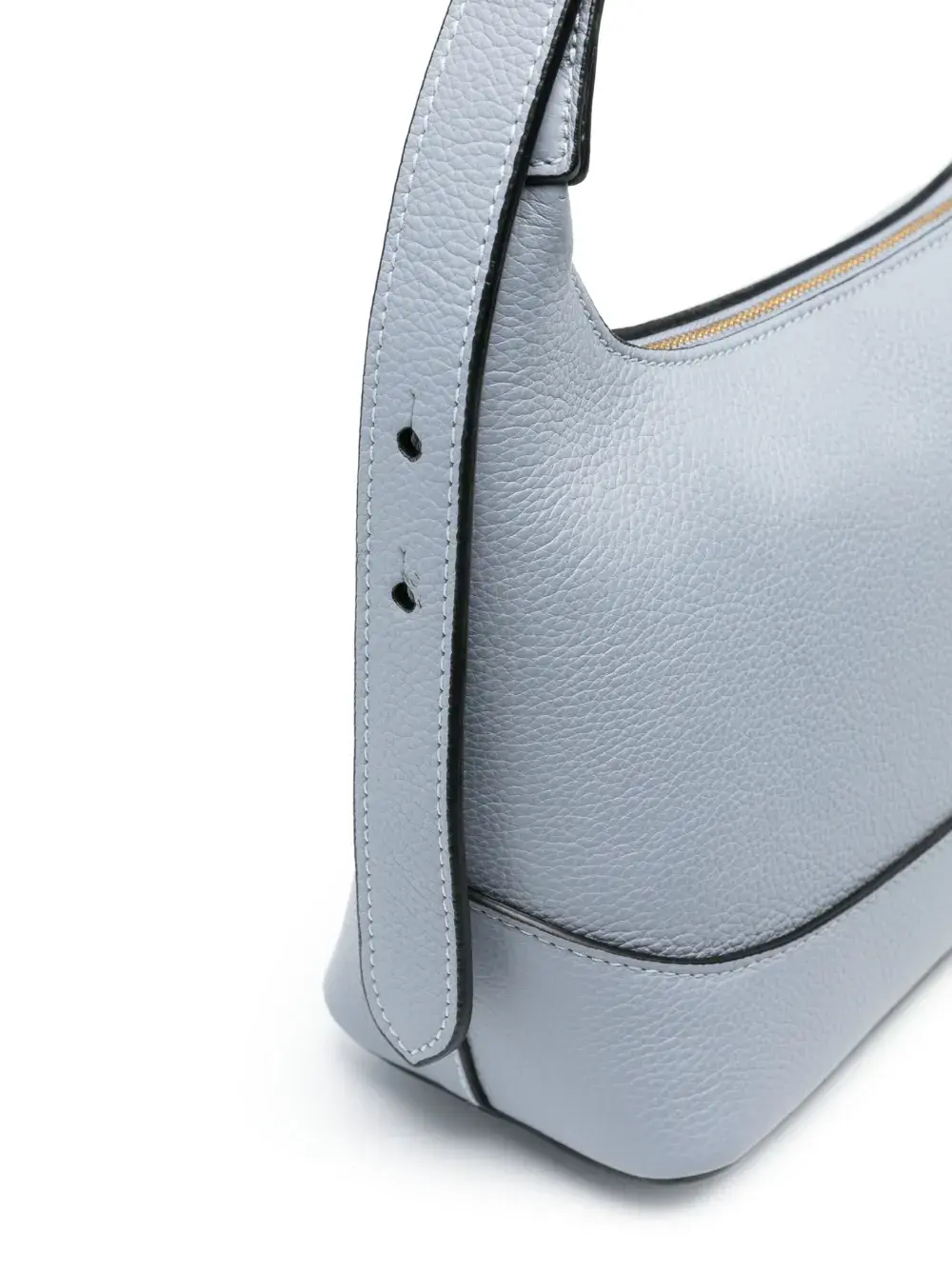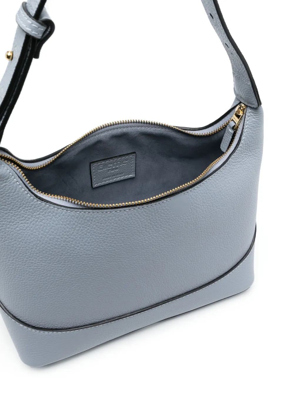 Голубой, черный, телячья кожа, нашивка с логотипом внутри, золотистая фурнитура, застежка на молнии сверху, регулируемая ручка и основное отделение.