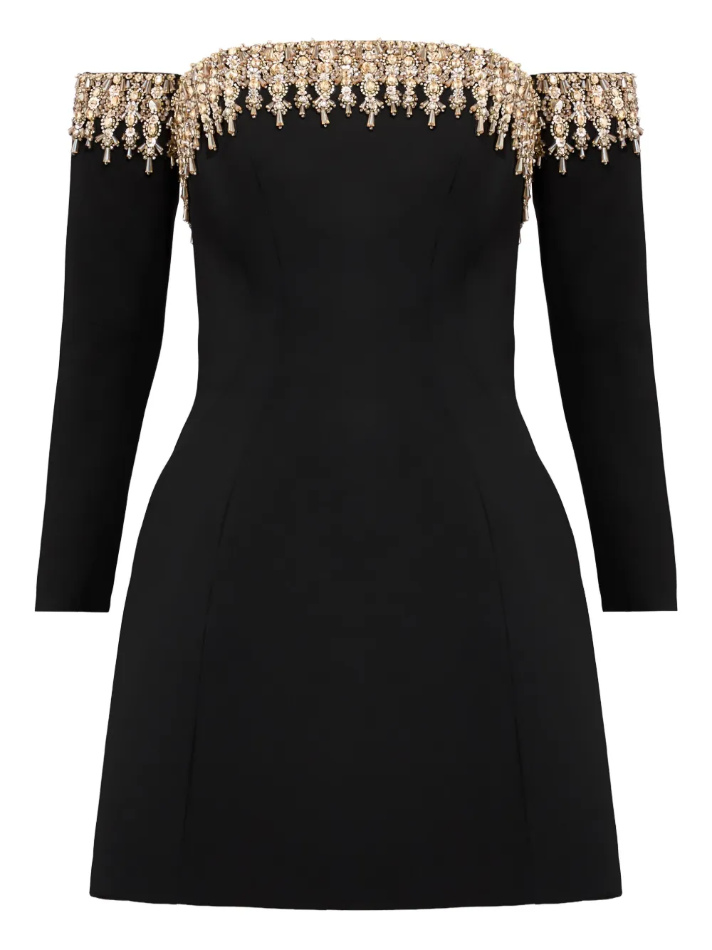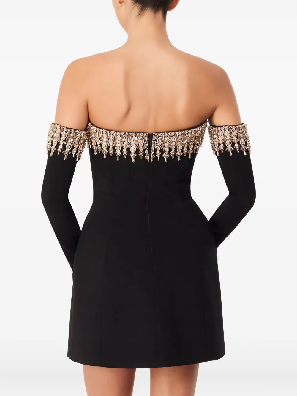 Черный вырез с открытыми плечами, длинные рукава, декорированный вырез сзади, застежка-молния сзади.