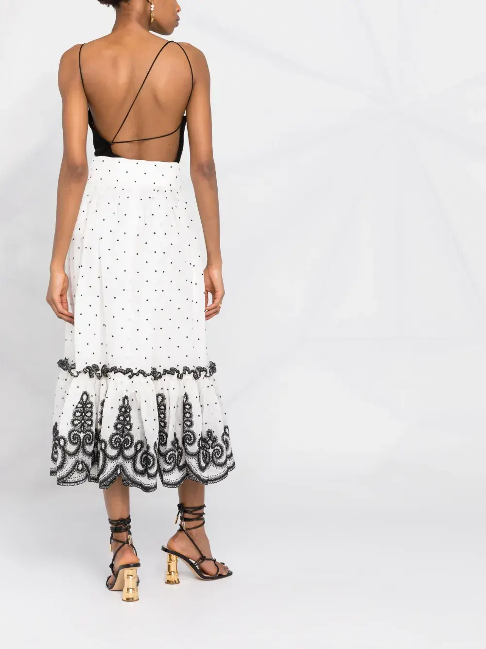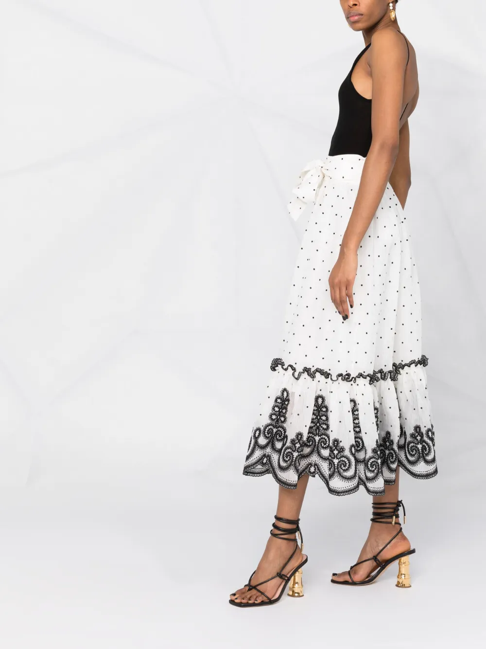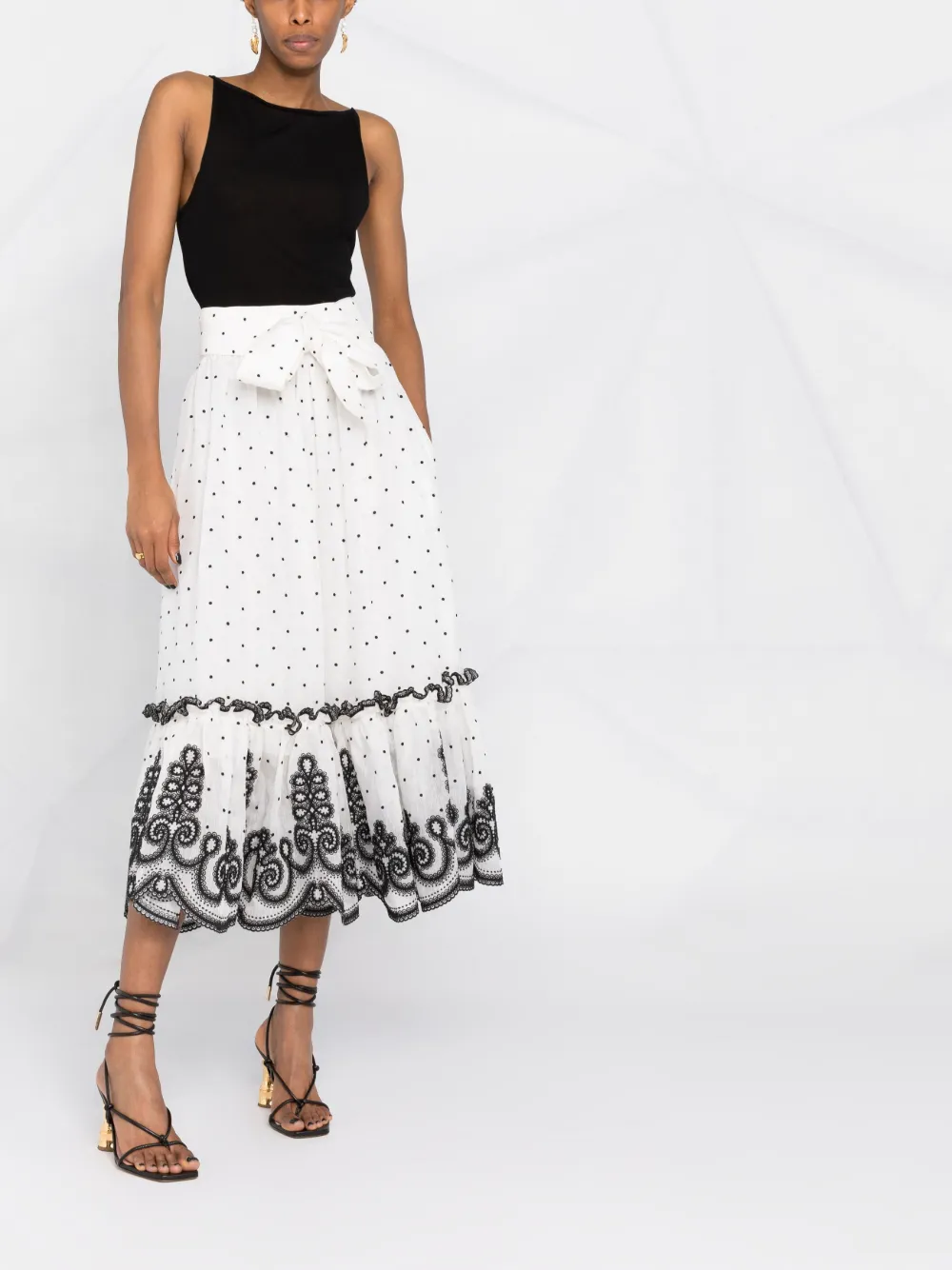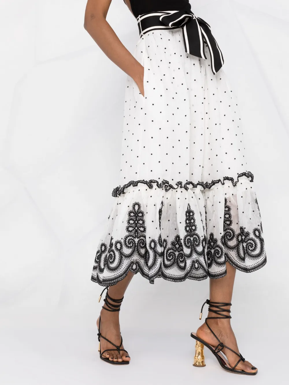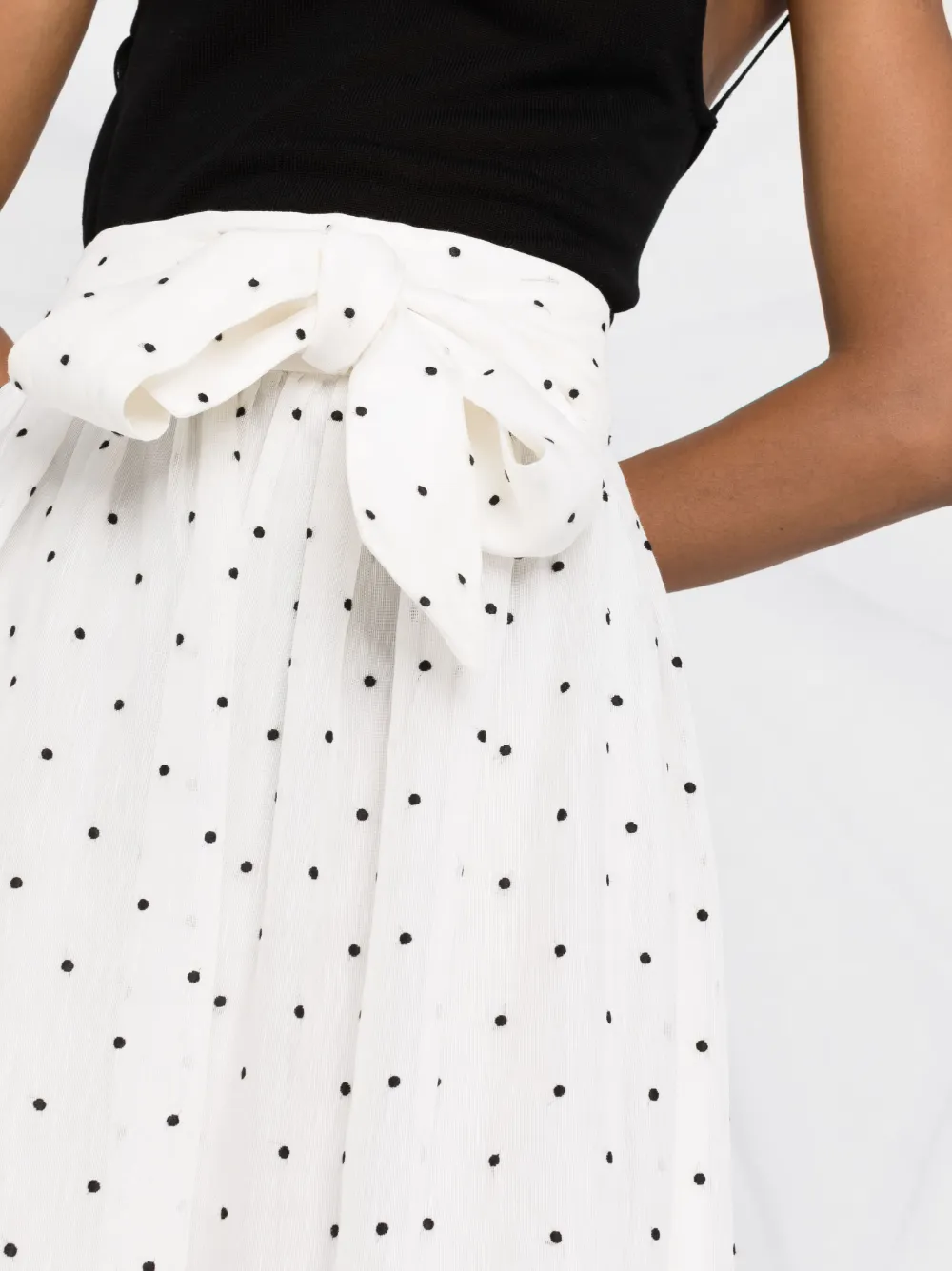 Белый принт в горох вставки с оборками вышивка края с фестонами завышенная талия завязки спереди потайная застежка на молнии сбоку