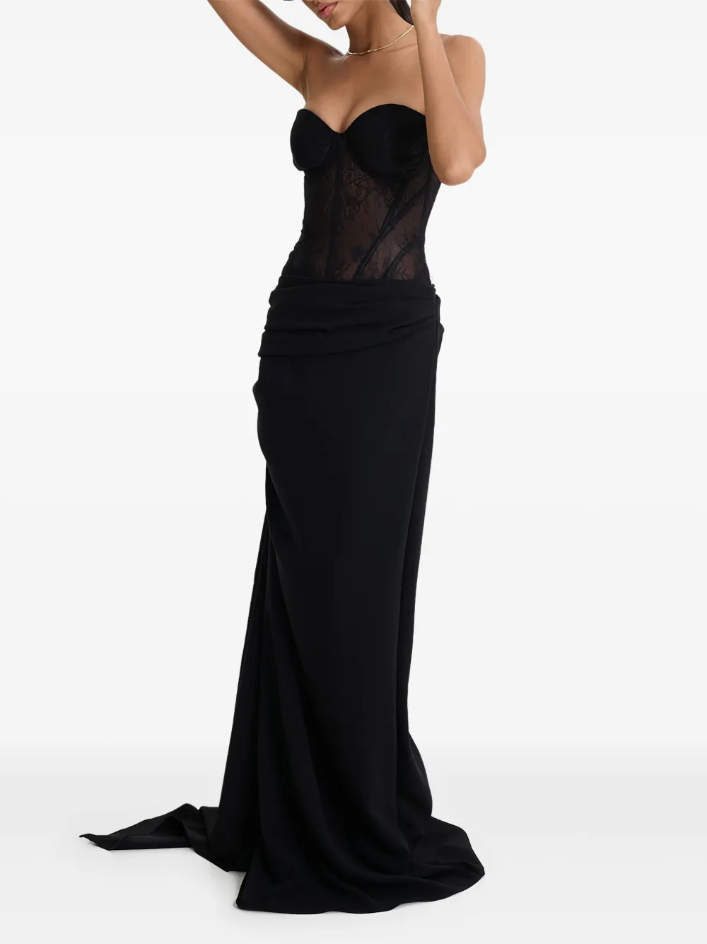 Черный кружевной лиф с косточками, вырез в форме сердечка, юбка с драпировкой, длина макси