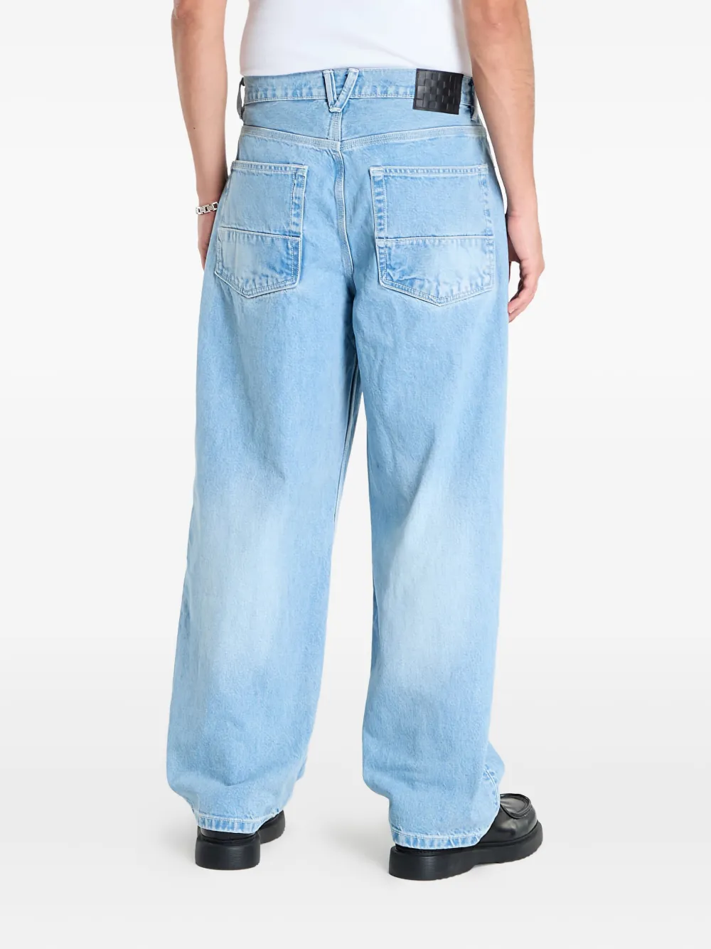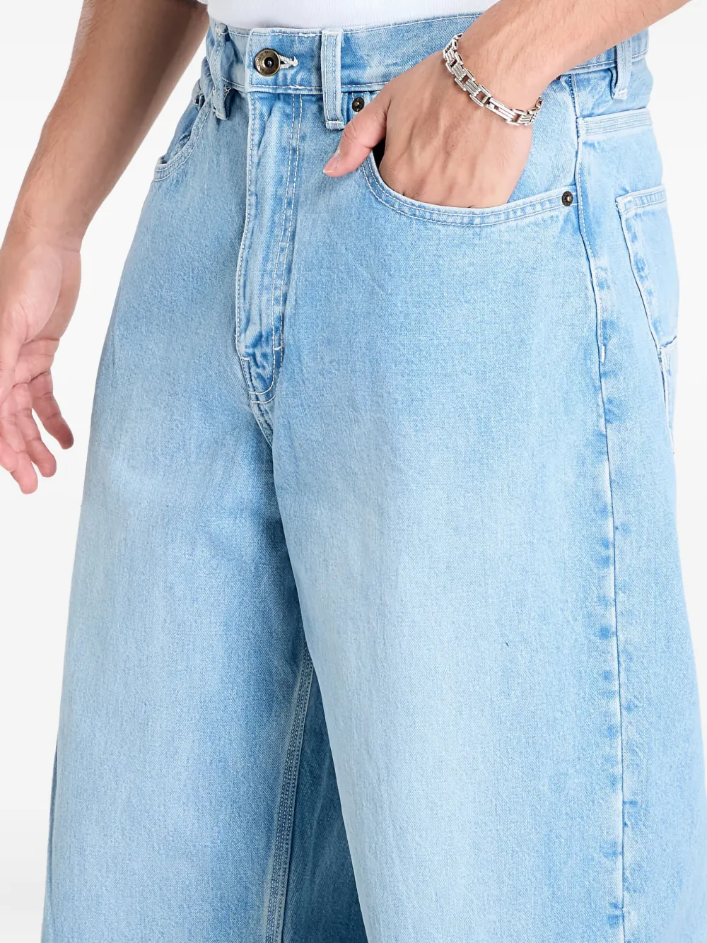 Светло-голубой, с пятью карманами, застегивающийся на пуговицы, прямой покрой