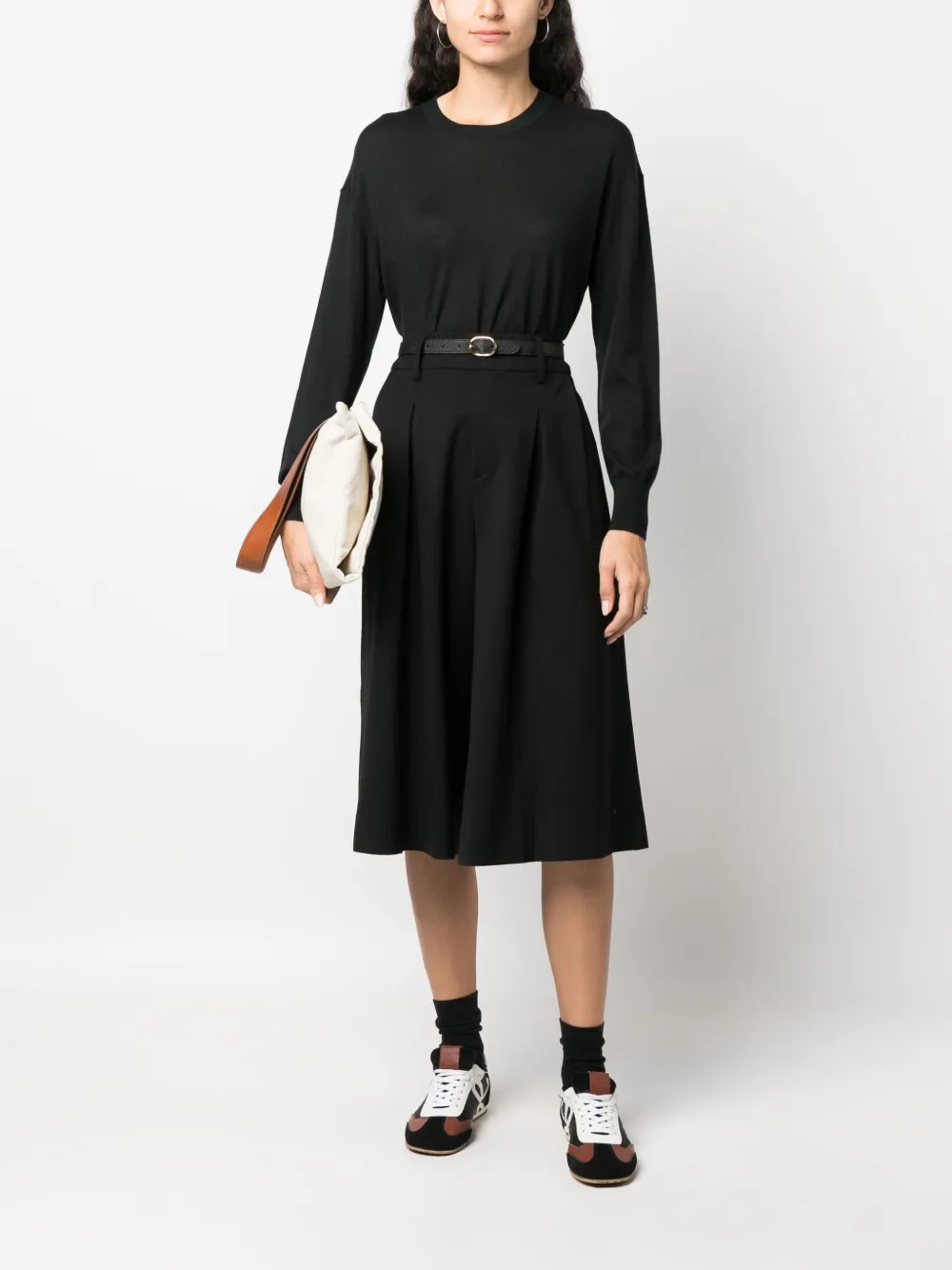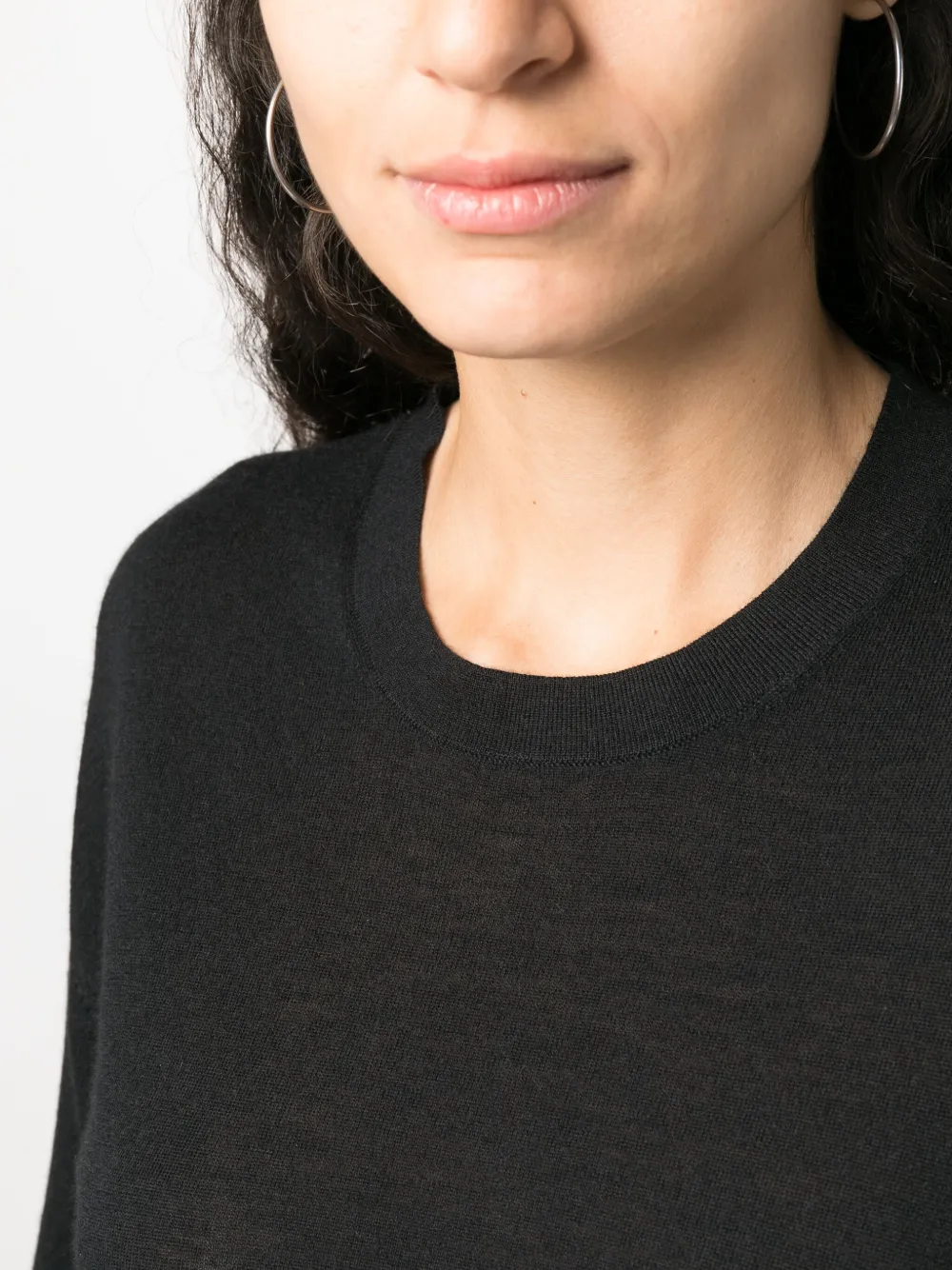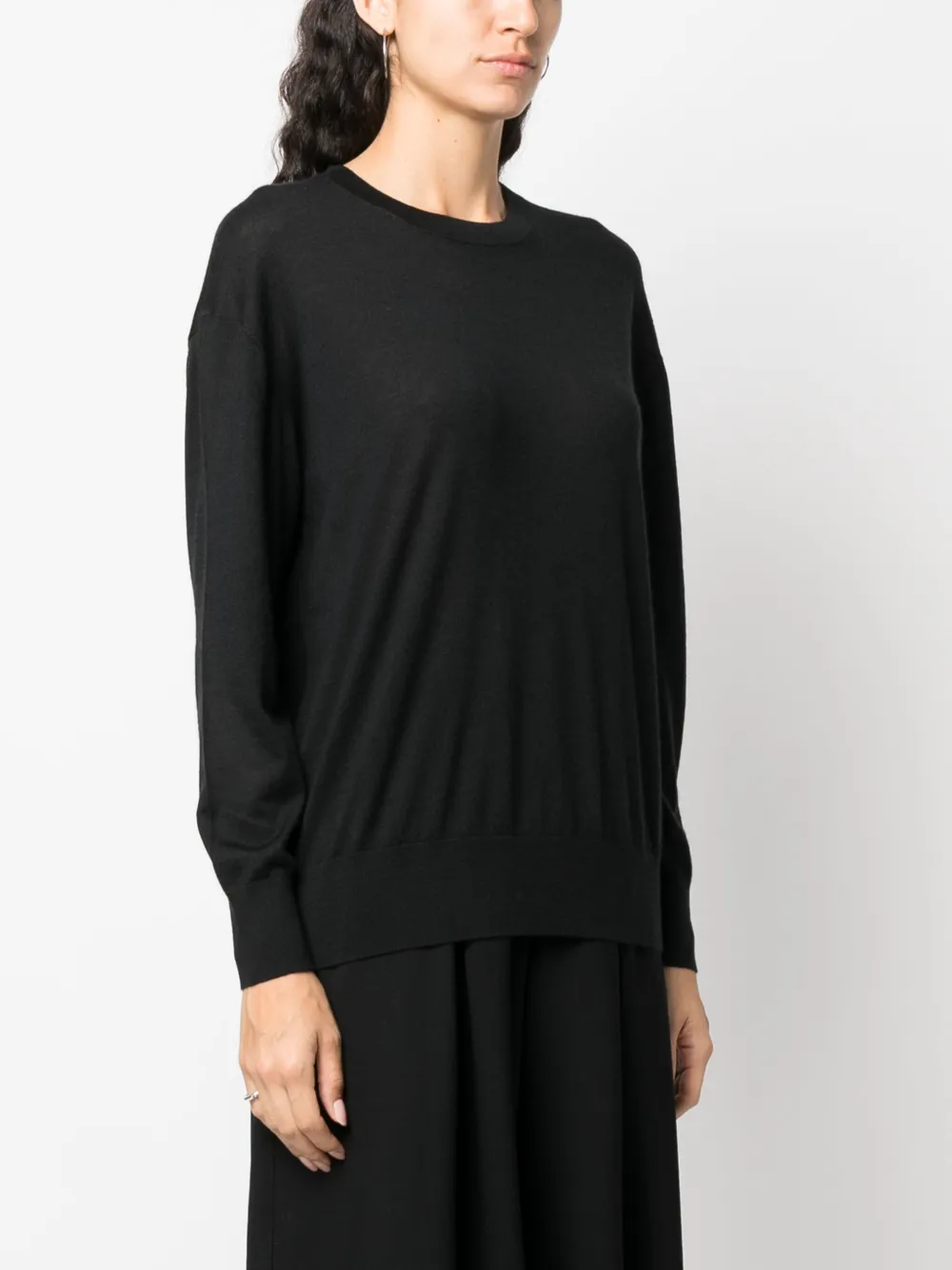 Черный, кашемир, ткань в мелкий рубчик, вязаные края в рубчик, круглый вырез, приспущенные плечи и длинные рукава.