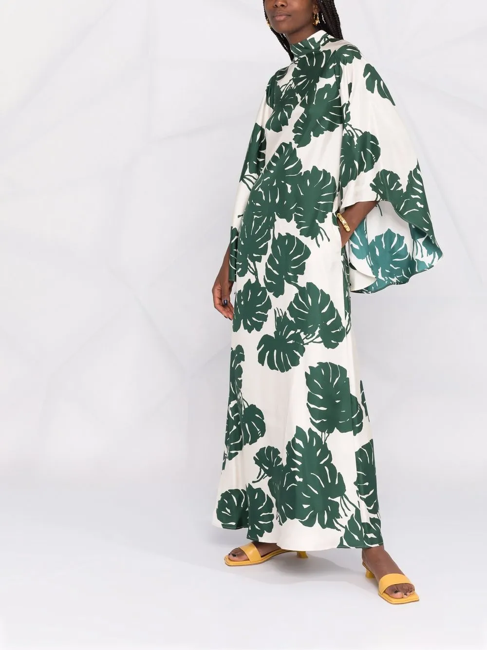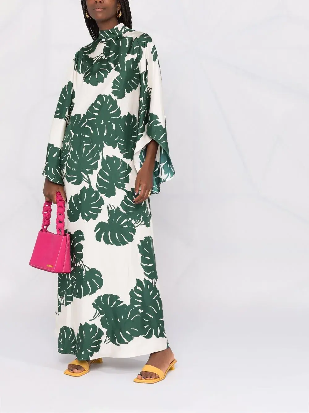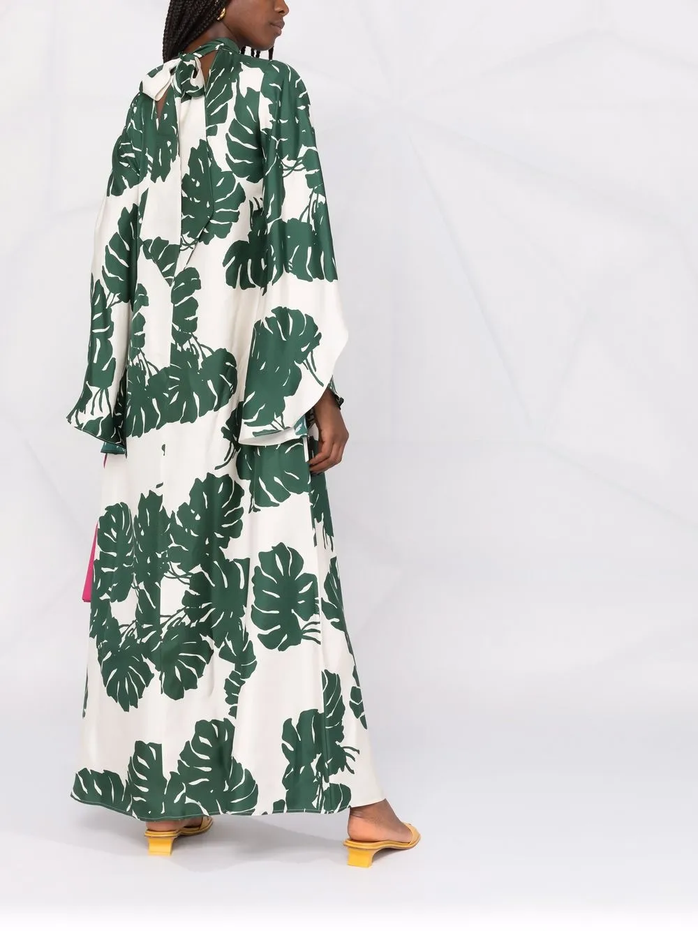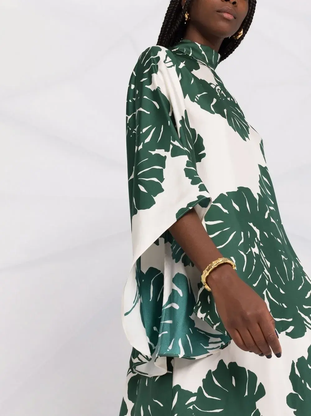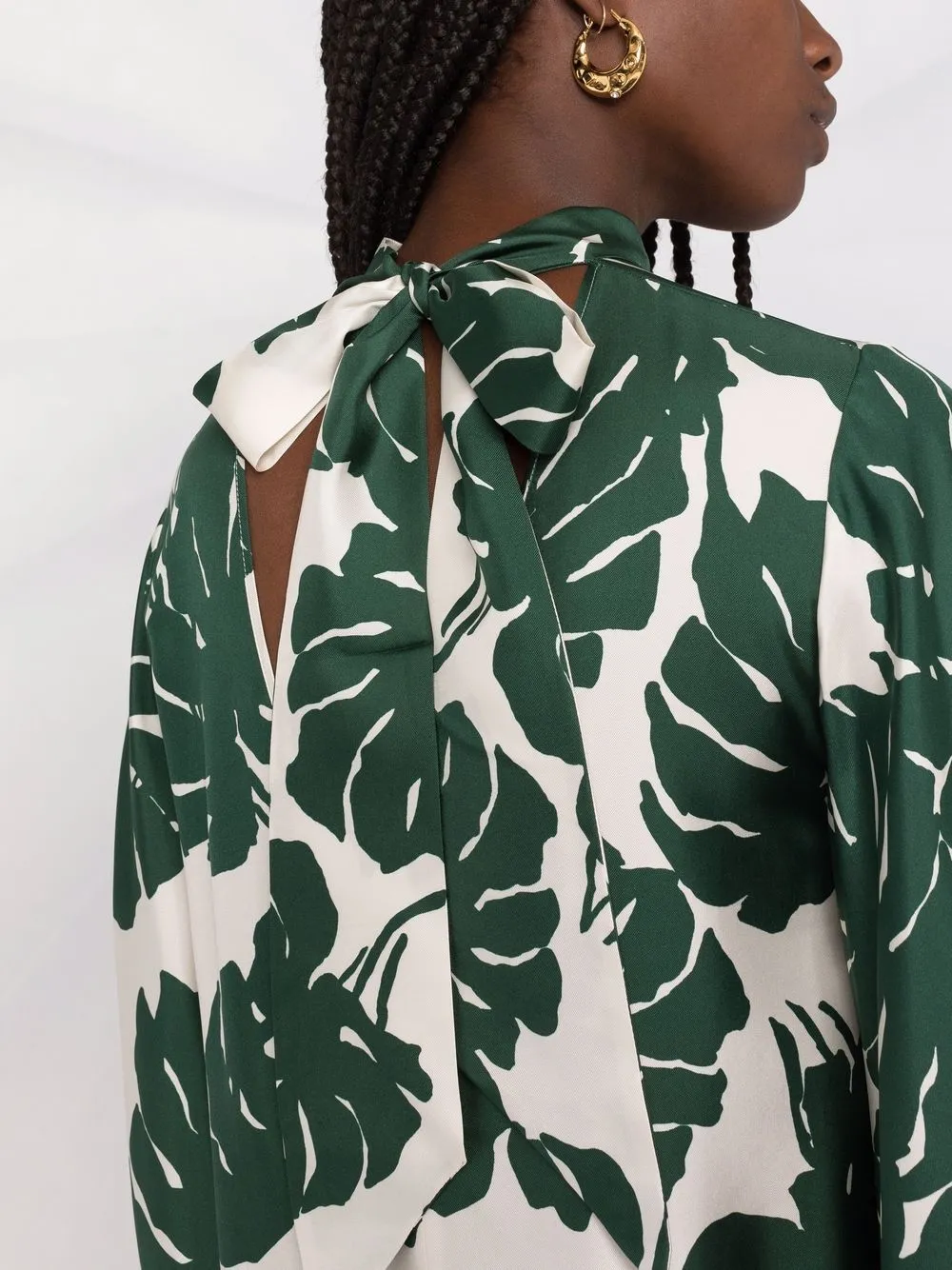Графичный принт, застежка на завязке сзади, длинные широкие рукава и силуэт трапеция.
