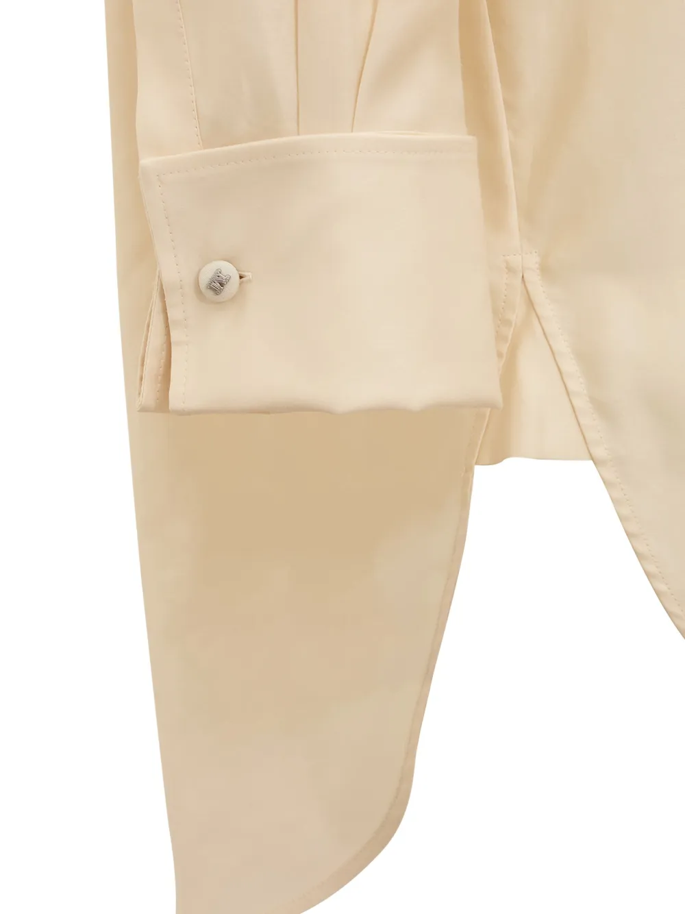 Кремовый воротник-стойка, закругленный подол, длинные рукава, застегивающиеся на пуговицы манжеты, пуговицы спереди