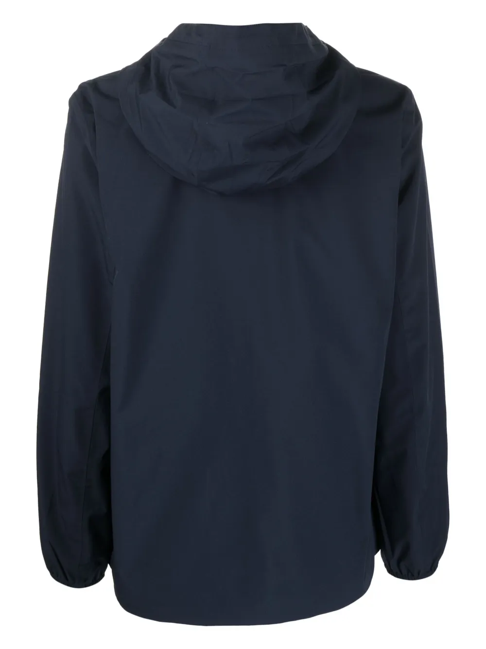Темно-синий, водонепроницаемый материал, нашивка с логотипом на груди, классический капюшон, застежка на молнии спереди, длинные рукава, эластичные манжеты, два кармана на молнии и подол с кулиской.
