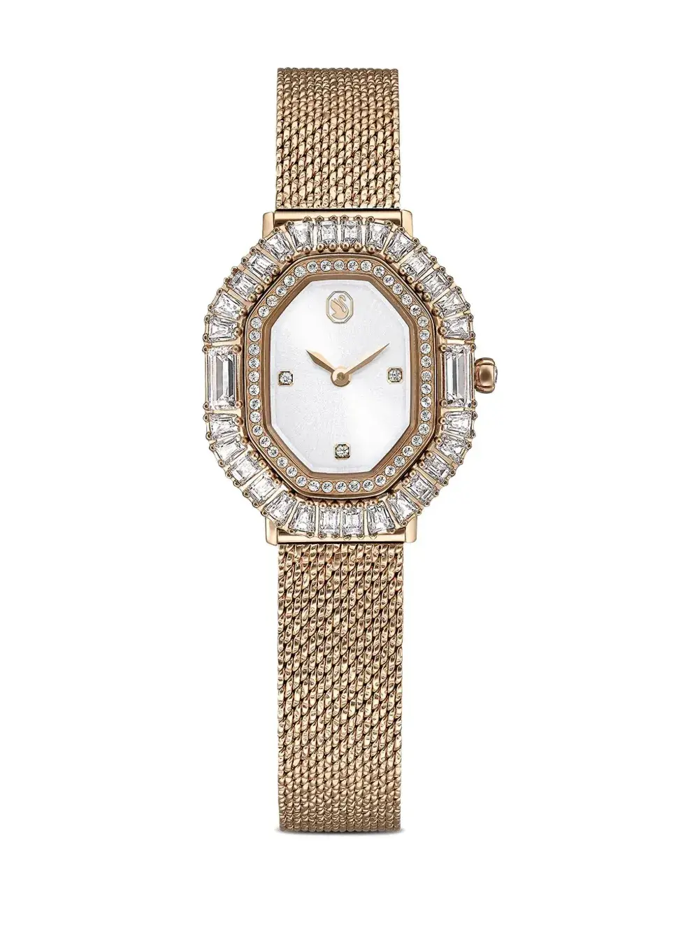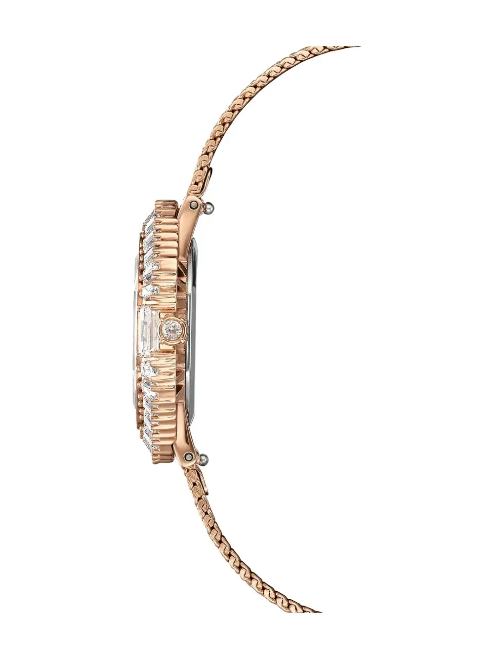 Корпус восьмиугольной формы розового цвета диаметром 30 мм, белый циферблат оправы из багетного стекла, маркеры циферблата из кристаллов, кварцевый механизм.