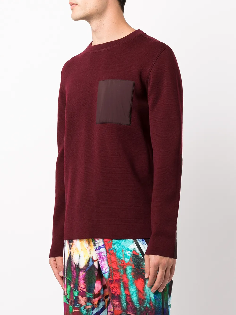 Тонкая вязка, нагрудный накладной карман, круглый вырез, длинные рукава и прямой подол. Цвет: красный.