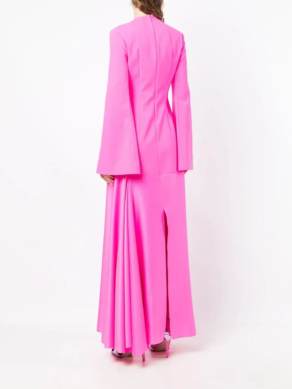 Круглый вырез, удлиненные рукава и длина макси.