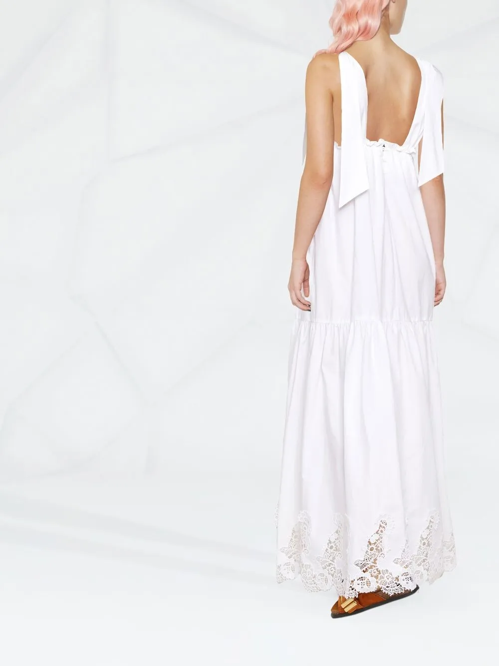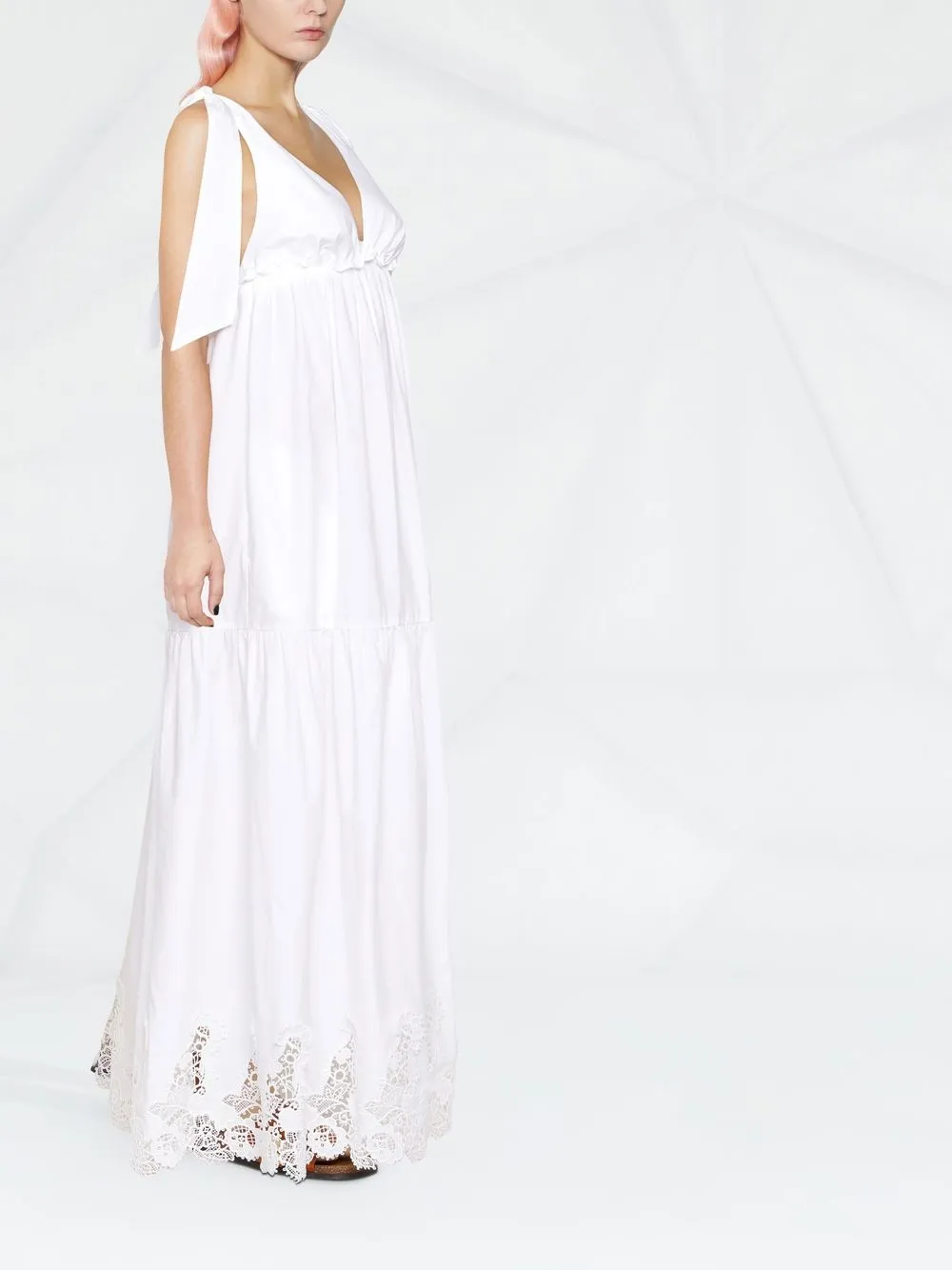 Вставки из кружева, ремешки на завязках, V-образный вырез, ампирный силуэт, ярусная юбка и длина макси. Цвет: белый.