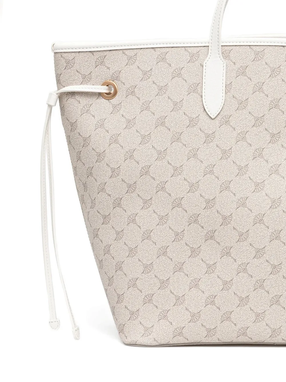 Бежевый узор с монограммой, две верхние ручки, завязка на шнурке, золотистый логотип
