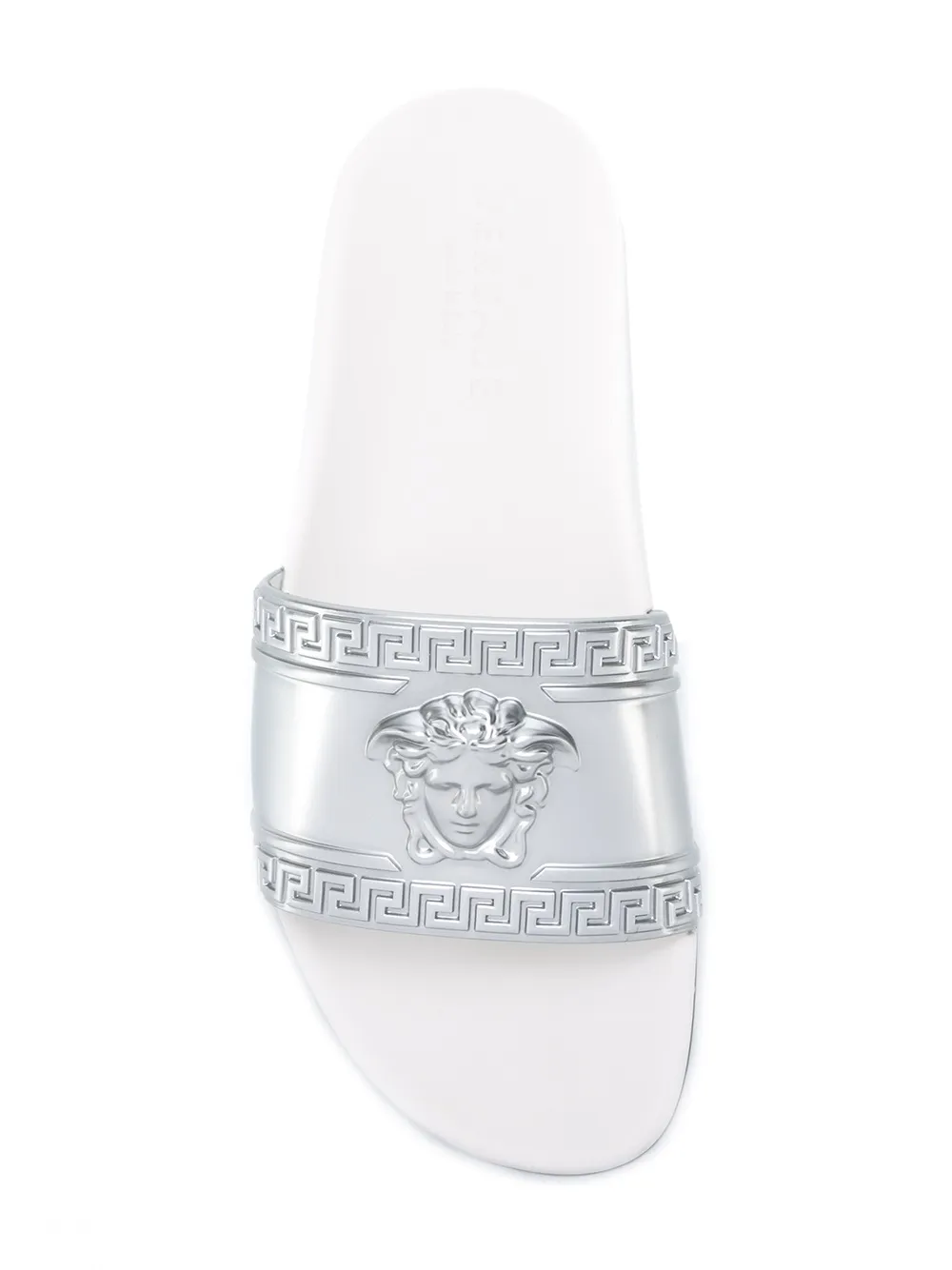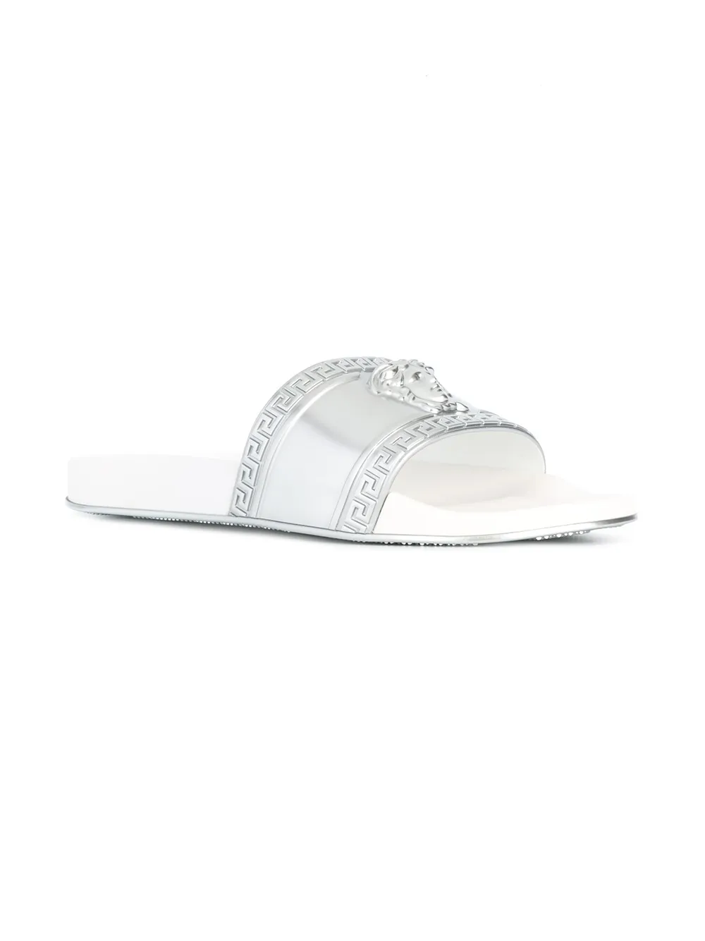 Белые с серебристым шлепанцы 'Medusa' от Versace(Версаче). Открытый носок, бляшка с логотипом спереди, модель слип-он, без застежки, стелька с тиснением бренда, плоская резиновая подошва.