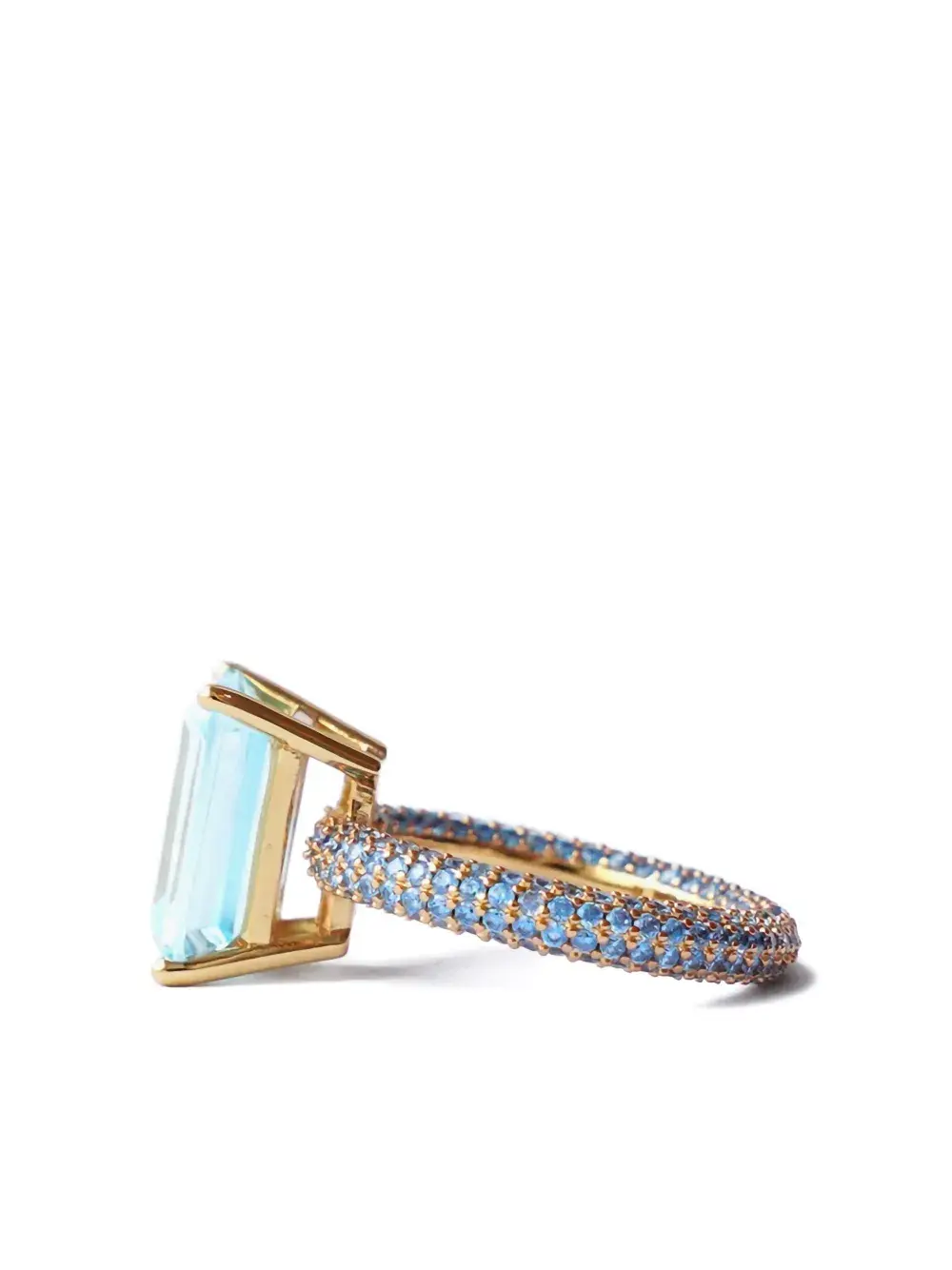 Светло-голубой драгоценный камень изумрудной огранки, золотая полоска, синие драгоценные камни, прямоугольный камень из переработанной латуни, покрытый 18-каратным золотом