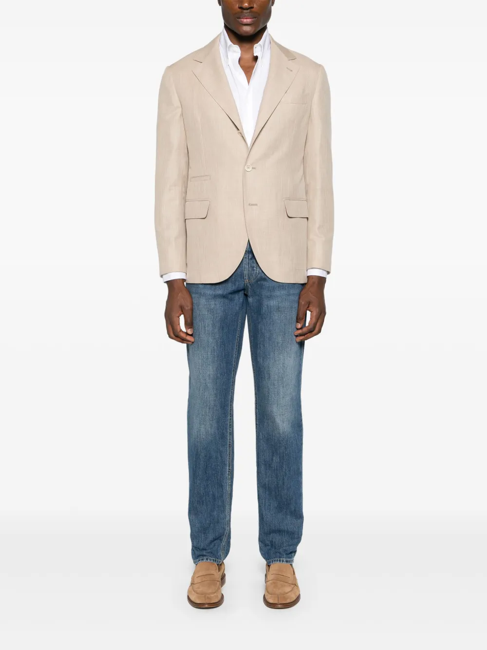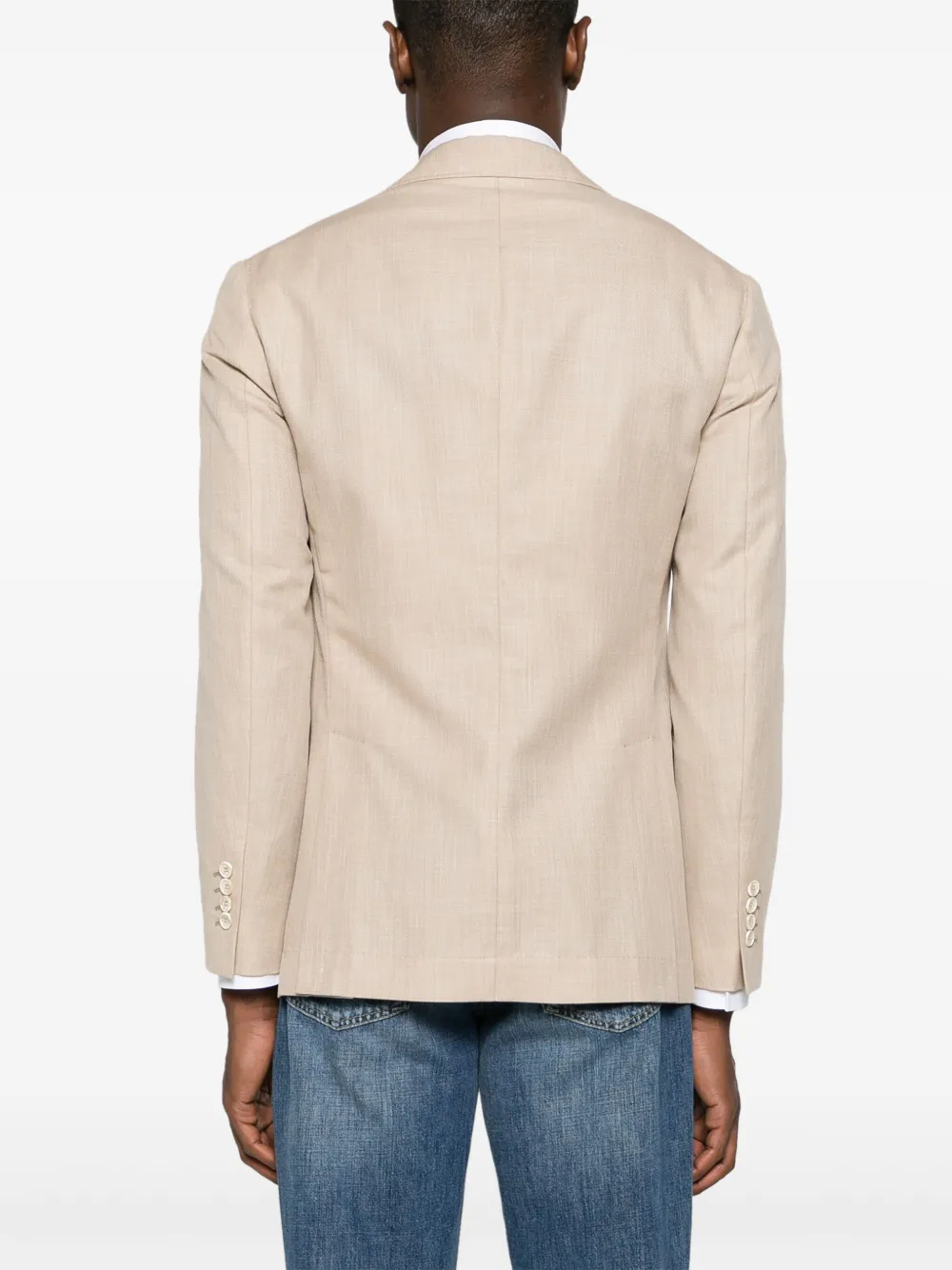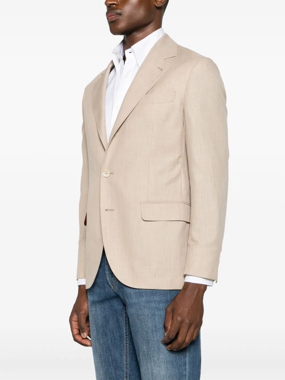 Подробнее о товаре: • светло-бежевый • смесь хлопка и вирджинской шерсти • эффект меланж • защипы • зазубренные лацканы • застежка на пуговицах спереди • подплечники • длинные рукава с манжетами на пуговицах • прорезной карман на груди • два передних кармана с клапанами • внутренние прорезные карманы • две боковые шлицы сзади • закругленный подол • частичная подкладка