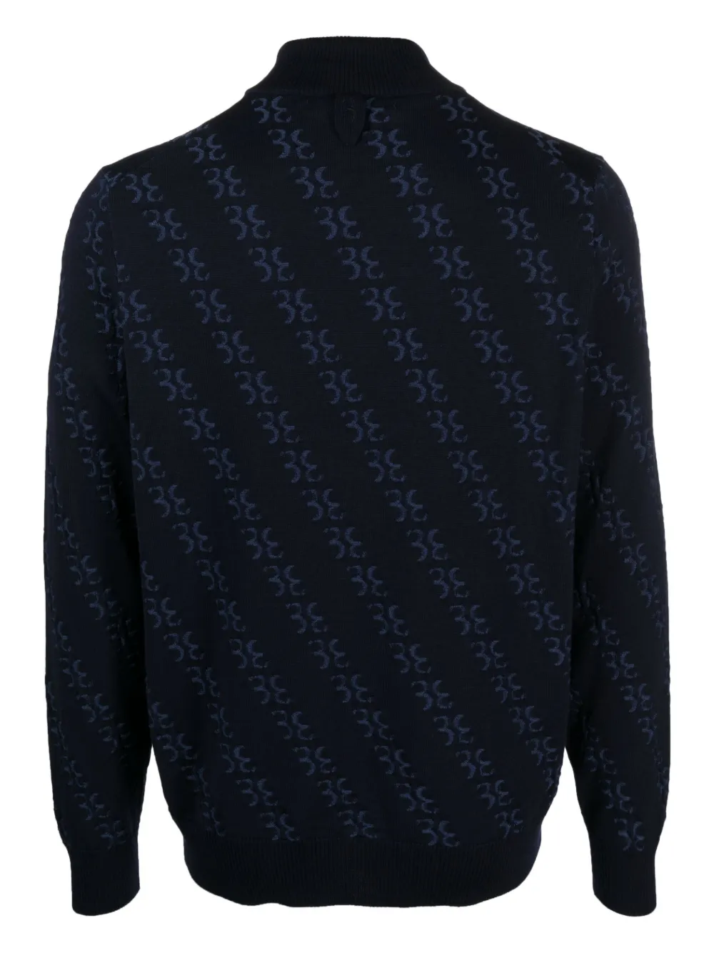 Темно-синий, смесовая шерсть мериноса, смесовый шелк, трикотажный материал, узор с изображением монограммы, высокий воротник, застежка на молнии спереди и длинные рукава.