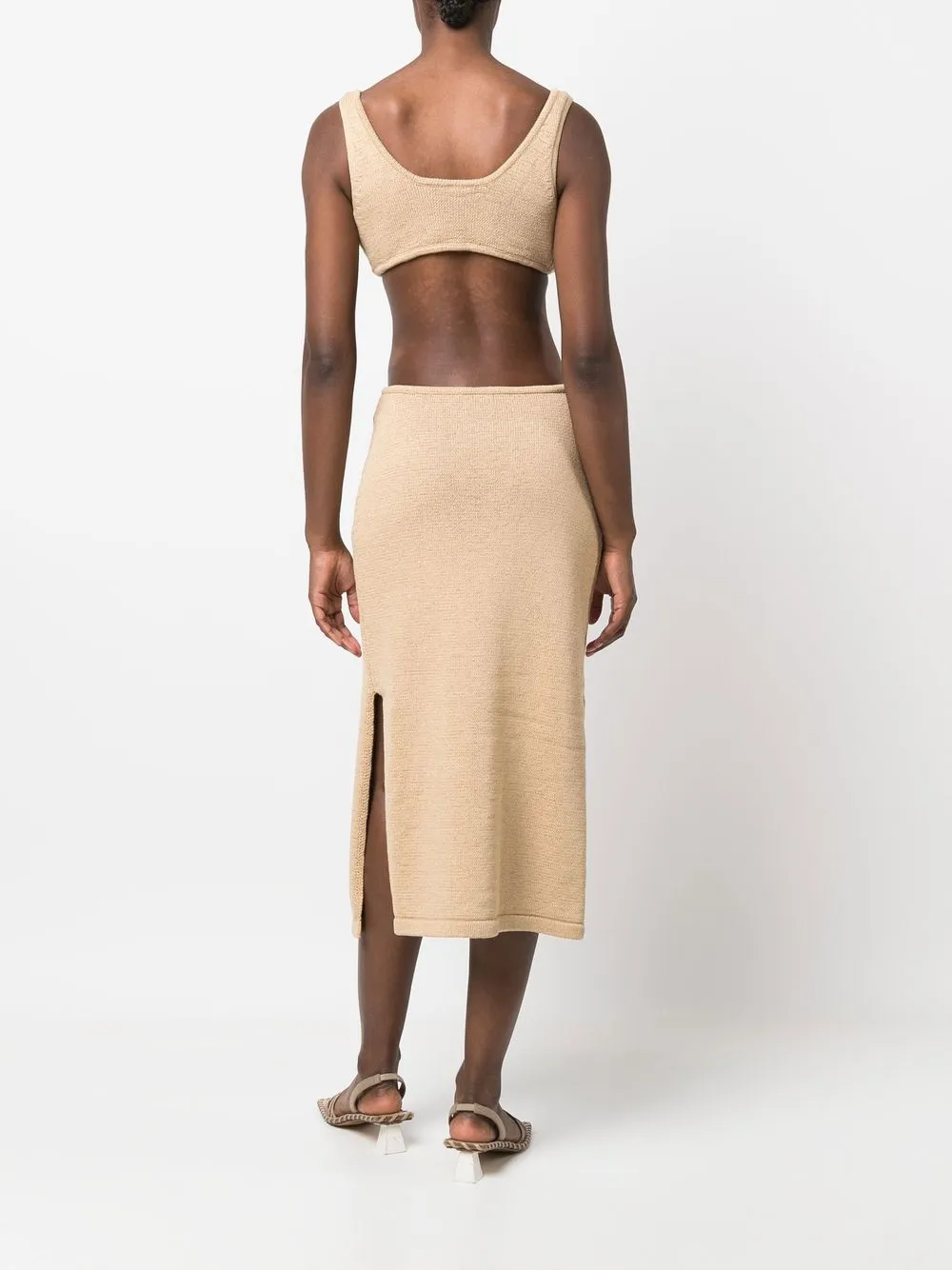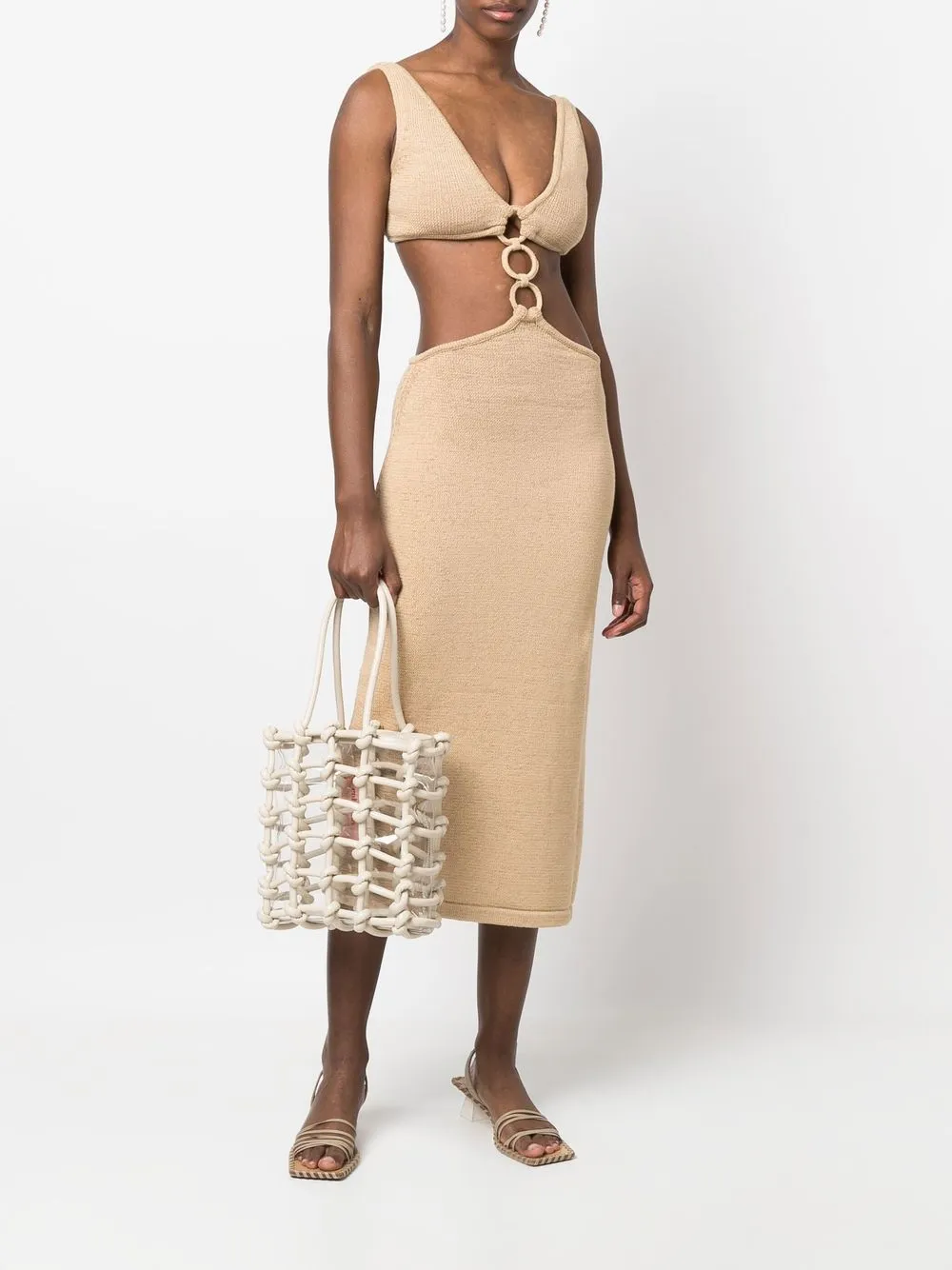 Песочный, смесовый хлопок, V-образный вырез, открытая спина, без рукавов, боковые разрезы и длина миди.