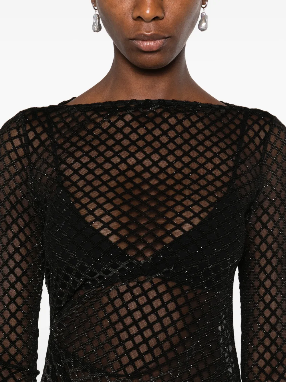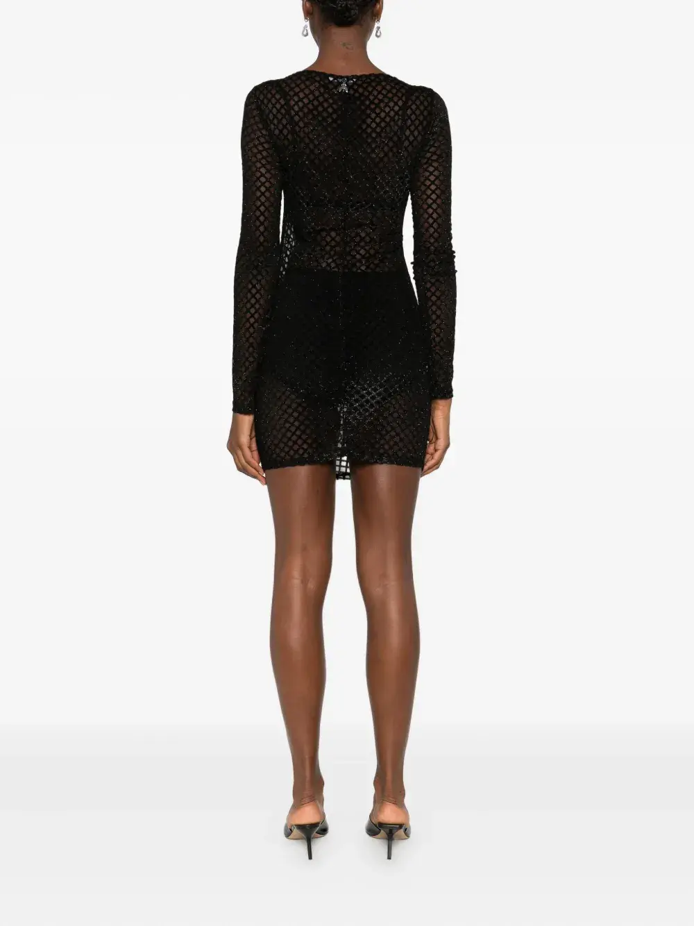 Черная сетчатая вставка, длинные рукава, блестящая отделка, круглый вырез, длина мини