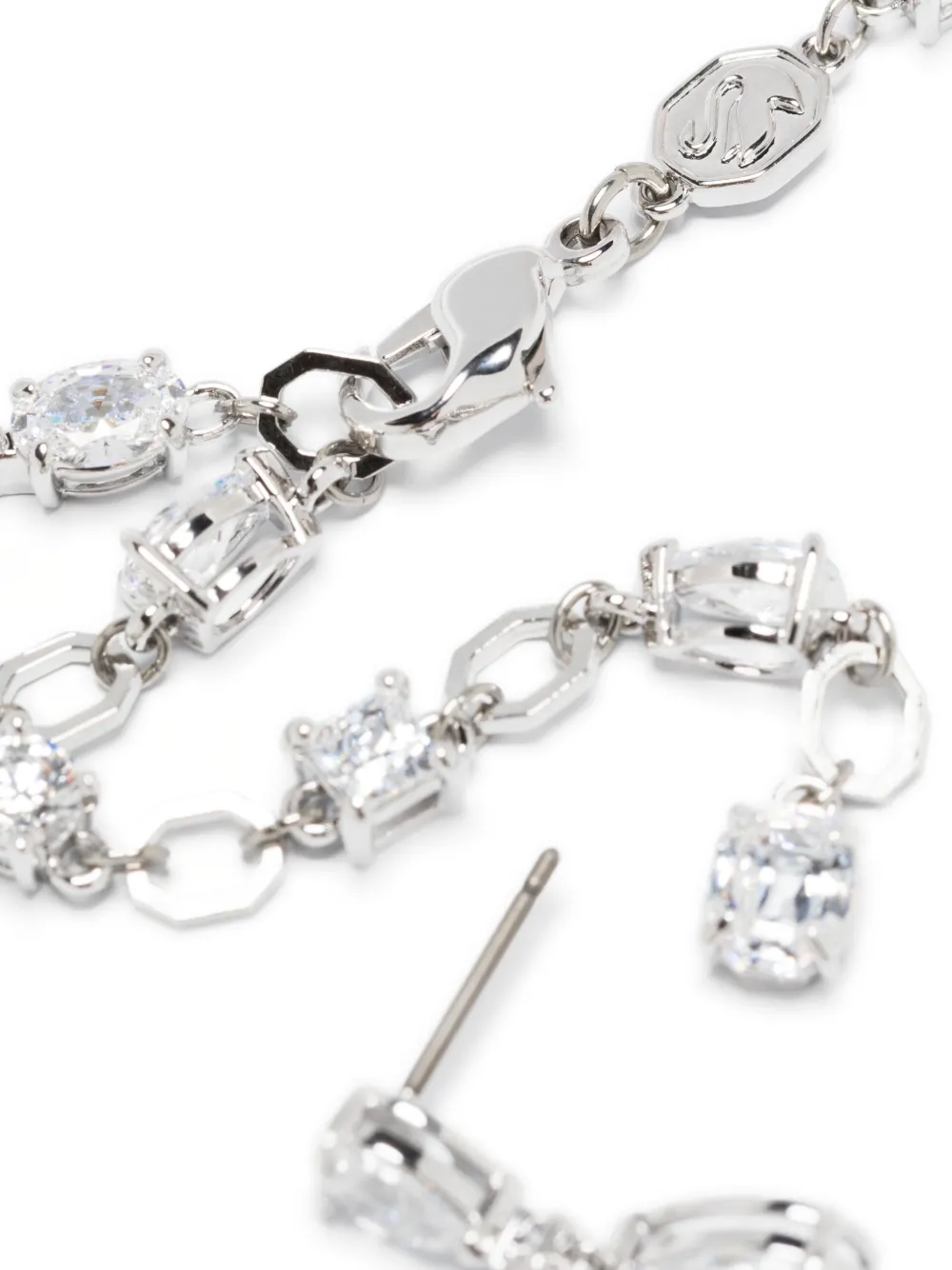 Глянцевая фактура, декор из кристаллов, регулируемая длина цепочки, застежка-карабин, серьги-подвески, декор из кристаллов и застежка-штифт. В комплект входят две серьги.
